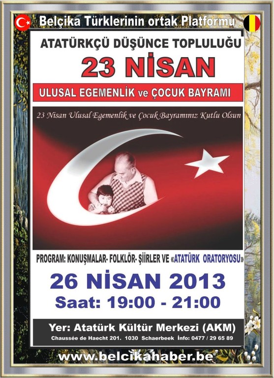 Cumhuriyetimizin kurucusu Mustafa Kemal Atatürk'ün çocuklara hediye ettiği '23 Nisan Ulusal Egemenlik ve Çocuk Bayramı 'Belçika'da bulunan Atatürkçü Düşünce Topluluğu' tarafından Chaussée de Haecht 201, 1030 Schaerbeek'de bulunan AKM salonunda bugün saat 19:00'da kutlanacaktır.