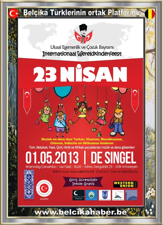 23 Nisan Ulusal Egemenlik ve Çocuk Bayramı, Anvers’te 1 Mayıs 2013 Çarşamba günü saat 16.00’da De Singel’de düzenlenecek olan programla kutlanacaktır. Programın afişi ekte sunulmaktadır. Etkinliklere tüm vatandaşlarımız davetlidir.