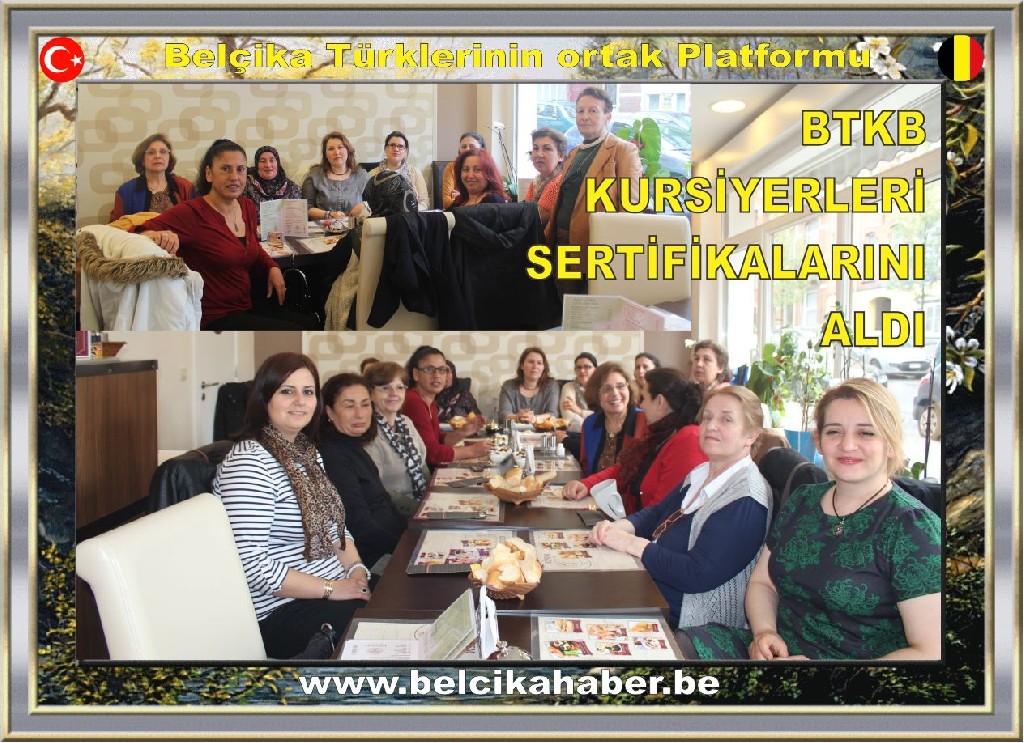 Kısa adı BTKB Belçika Türk Kadınlar Birliği, Başkan ve Kurs Eğitmeni Leyla Teker'in öncülüğünde 'El Sanatları Kursu'nu tamamlayan, kursiyerlerine 'Köşem Kahvaltı Salonu'nda sertifikalarını verdi.