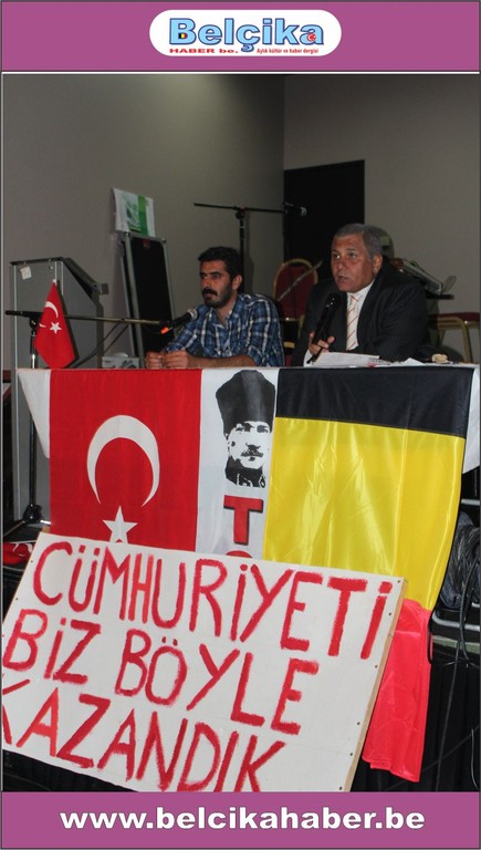 Belçika TGB Başkanı Deniz Küçük davetlilerin Cumhuriyet bayramını kutlayarak başladığı konuşmasında "Belçika TGB olarak ülkemizin sorunlarıyla yakından ilgileniyor vatanımızı cumhuriyetimizi savunma adına Atatürk'ün gösterdiği aydınlık yolda yürümekteyiz. Atam izindeyiz derdik ancak izinler kaldırıldı şimdi vatanı, bayrağı ve cumhuriyeti savunma adına mücadele ediyoruz. Büyük önderimiz Mustafa Kemal Atatürk, yoksul, perişan, moralsiz bir halkı ayağa kaldırarak Cumhuriyetimizi kurmuştur. Emperyalizmin tüm kollarının kuşattığı ülkemizde aldatılmıi ve kışkırtılmş bir toplulukla karşı karşıyayken önce bir birliği sağladı, daha sonra bu halktan bir ordu oluşturdu bu ordunun zaferleriyle'de, bir milleti ayağa kaldıraran bugünkü Cumhuriyetimizi kurmuştur. Büyük lider Atatürk,önce bir vatan, sonra bir millet ve sonrada bu vatanda bağımsız yaşayacak millete uygar bir gelecek hazırlamıştır. Ortaçağ kalıntısı kulluğa, köleliğe bağlı, feodal bir ümmet imparatorluğundan, fikri ve vicdanı hür vatandaşlığa dayalı çağdaş bir ulus yaratmıştır. Silah arkadaşları ve halkın büyük desteğiyle kurulan Cumhuriyetimiz bugün tehlike altındadır. Atatürk’ün çizdiği yolda birlik ve beraberlik içinde Cumhuriyet’e sahip çıkmak hepimizin vazifesidir. Bu duygularla bir kez daha Cumhuriyet Bayramımızı ve bayramınızı kutluyorum" dedi.