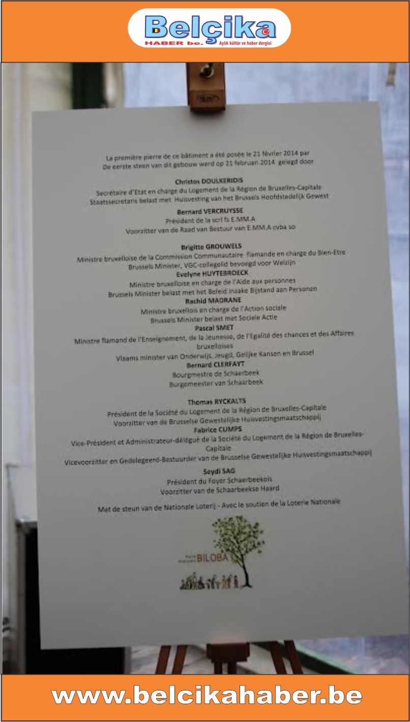 Törende konuşan Schaerbeek Sosyal Konutlar Başkanı Seydi Sağ konuşmasında projenin hayata geçirilmesi ve temel atımında duyduğu memnuniyeti ifade etti : « Biloba evleri mahallelerde kültürel çeşitliliği teşvik etmek için iyi bir örnek teşkil ediyor.