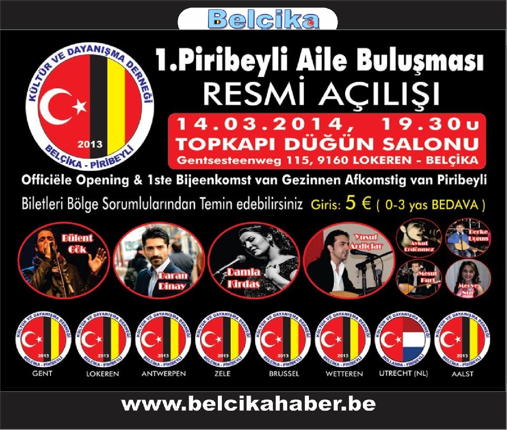 Piribeyliler Kültür ve Dayanışma Derneği, Başkanı Necdet KARATAŞLI, "2013 yılında Belçika'nın başkenti Brüksel başta olmak üzere Gent, Lokeren, Antwerpen, Zele, Aalst ve Wetteren'de dernek merkezlerini oluşturduklarını" belirterek, "Belçika'da yaşayan tüm Piribeylilerin katılacağı resmi kuruluş çalışmalarımızı 14 Mart 2014 , Saat 19,30'da Gentsesteenweg 115, 9160 Lokeren adresinde bulunan 'Topkapı Düğün Salonunda' gerçekleştirilecek '1. Piribeyliler Buluşmasına' T.C. Anvers Baskonsolosu, Kemalettin ERUYGUR, Senatör, Fatma PEHLiVAN, Millet Vekili, Veli YÜKSEL, Sint Joos Belediye Başkanı, Emir KIR, Gent Belediye Baskan Yardimcisi, Resul TAPMAZ, Gent Belediye Encümeni, Mehmet Sadık KARANFiL, Anderlecht Belediye Encümeni Mustafa ULUSOY ve çesitli federasyonlar ve sivil toplum kuruluş temsilcileri'nin katılacağı buluşmada, Bülent Gök, Baran Dinay, Damla Kırdaş ve Yusuf Ardıçlar sahne alacaklardır" dedi.