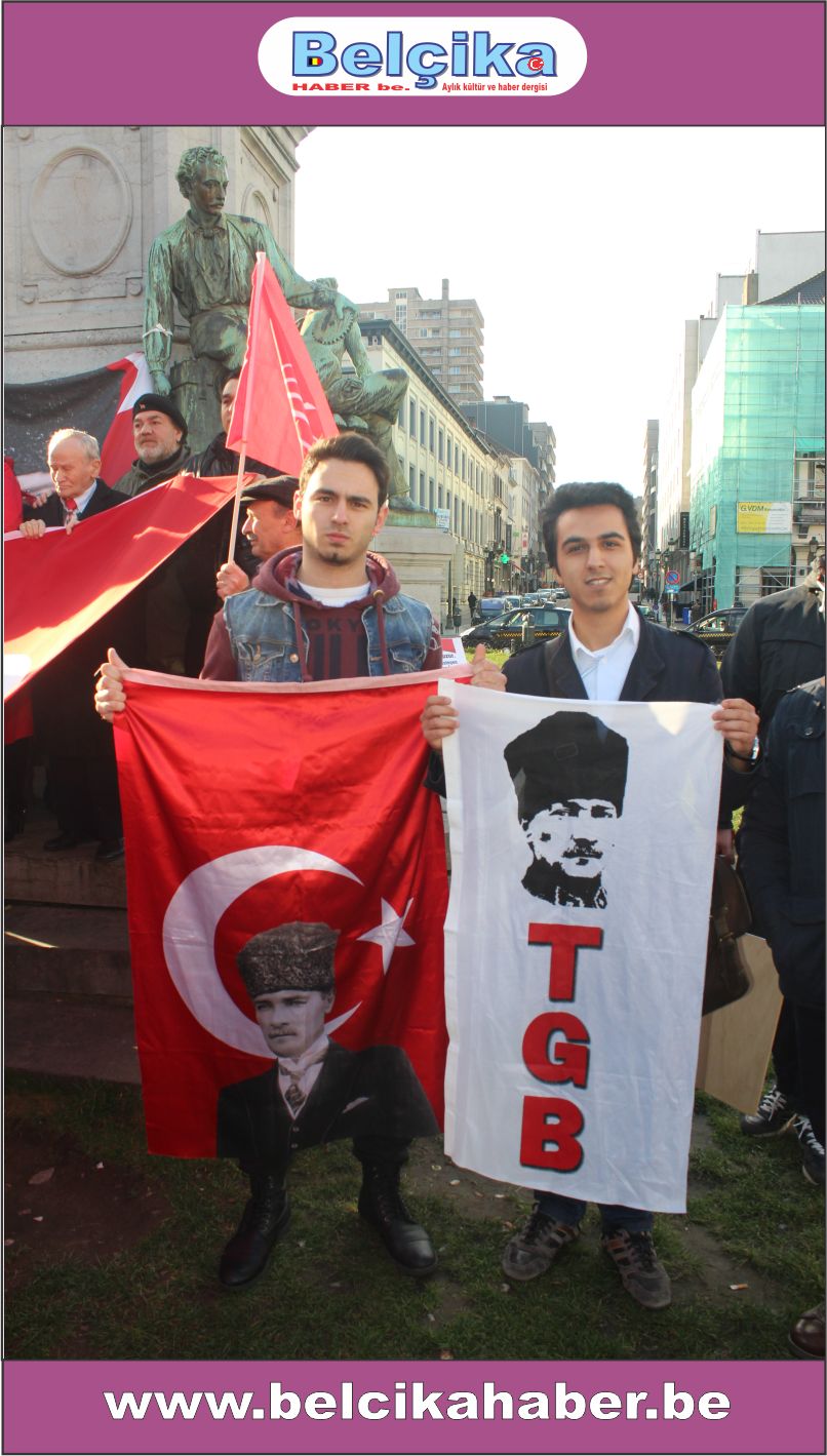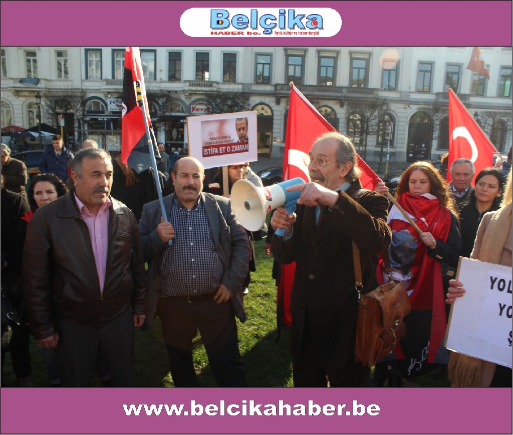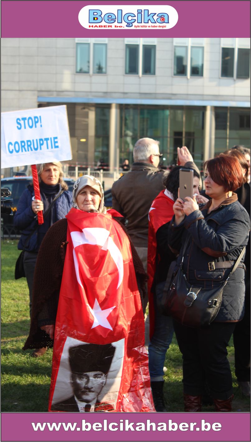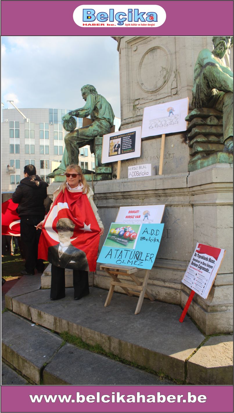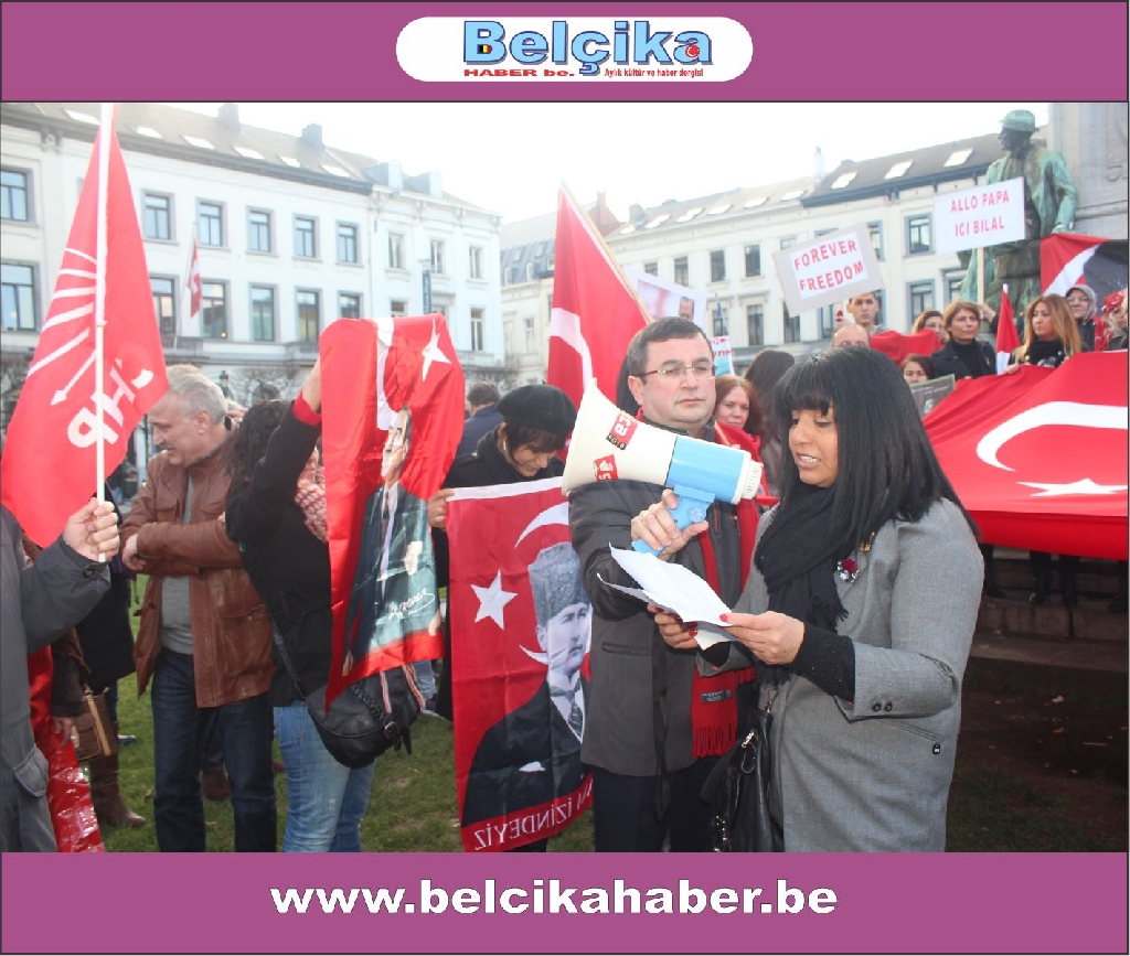 Atatürkün laik eğitimi yok etmeye çalışan dini eğitim sistemlerinin model alınmasına,erkek eğemen bir toplum oluşturulmaya çalışılmasına, bilimden uzak hurafelere dayalı bir sistem oluşturulmasına, çocuk gelinlere DUR DEMEK için buradayız. Ülkemizde umutların tüketildiği,ekonomik ve sosyal nedenlerle intiharların arttığı bir dönem yaşanırken BAŞBAKANIN ,BAKANLARININ VE OĞULLARININ YOLSUZLUKLARINA DUR DEMEK için buradayız… Belçika da yaşayan Türkler olarak Anavatanımızdaki sorunlara kayıtsız kalmadığımız için buradayız » dedi