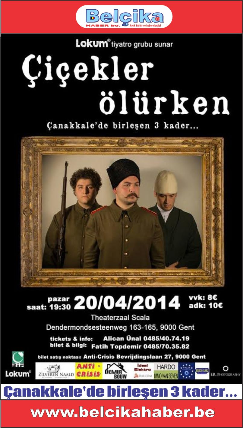 Alican Ünal yönetiminde Gent’te çalışmalarına başlayan Lokum Tiyatro Grubu, Çanakkale Savaşı’nın en acımasız ortamında hayatları birleşen 3 farklı dünyanın insanı, Garip Hasan, Nizamettin Paşa ve Derviş Mehmet’in hasret, özlem ve ayrılık dolu hikayelerini “Çicekler Ölürken” adlı oyunla sahneye taşıyor.