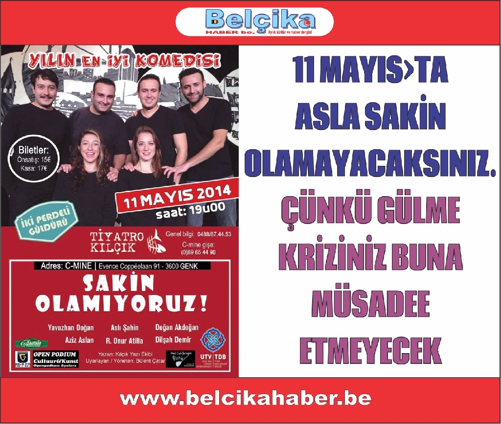 Tiyatro Kılıç ekibi Belçika Genk'de ''Sakin Olamıyoruz' adlı 2 perdelik güldürüsüyle sahne alacak. Sakin olamayacaksınız, çünkü gülme kriziniz buna müsade etmeyecektir.