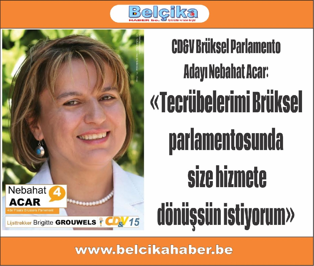 CD&V Brüksel parlamentosu 4. sıra adayı nebahat Acar: "25 Mays 2014 Avrupa, Federal ve Bölge Parlamentoları seçimleri hızlı bir şekilde ilerliyor. Brüksel parlamento CD&V partisinden aday olarak sizin desteğinize talibim."