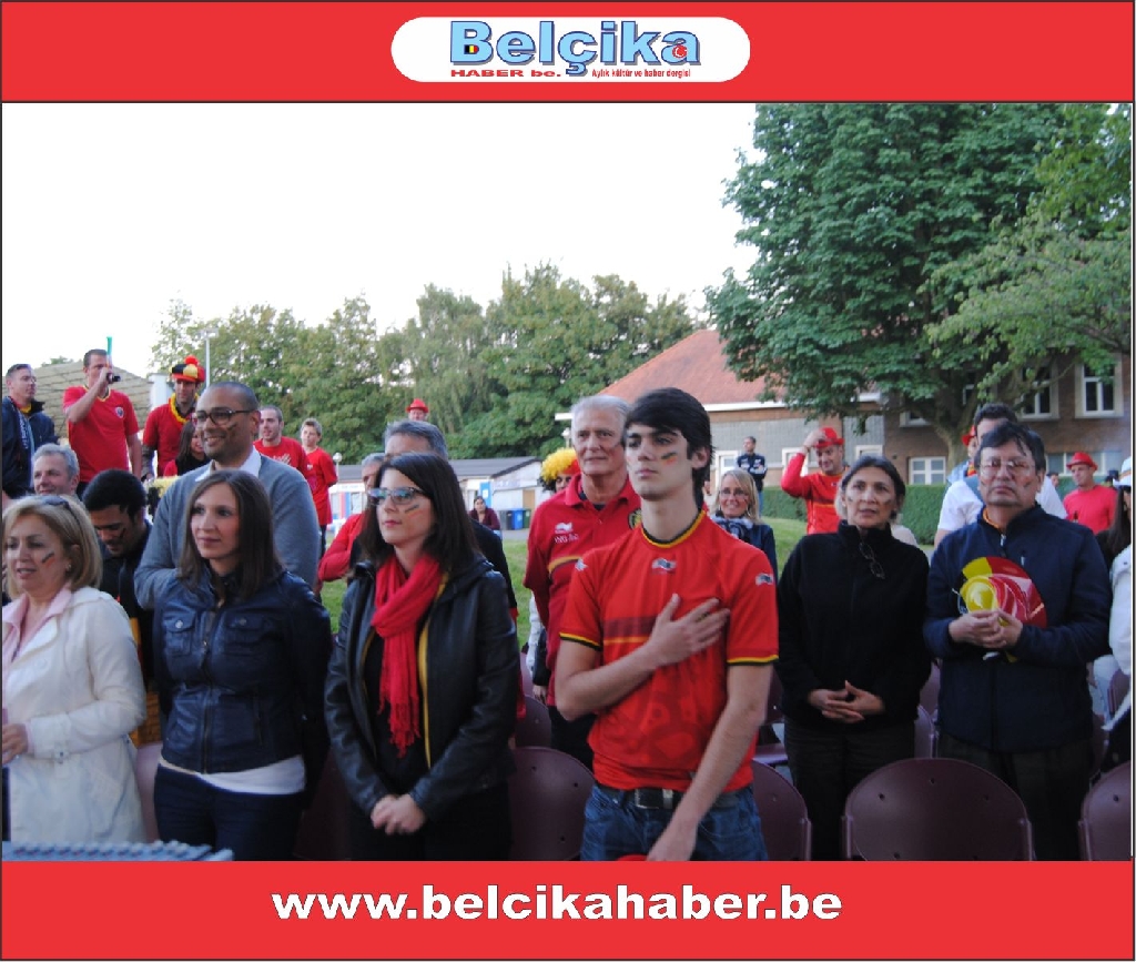 Belçika-ABD maçını dev ekrandan maçı izleyenler, Başkan Emir Kır'la birlikte ellerini kalplerinin üzerine koyarak Belçika Milli Marşı'nı birlikte okudular.