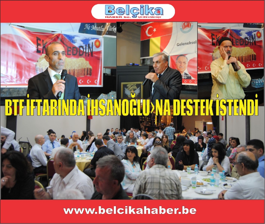 Kısa adı BTF olan Belçika Türk Federasyonu tarafından Brüksel Royale salonunda gerçekleştirilen iftar yemeğinde konuşmacılar 'Cumhurbaşkanlığı seçiminde huzurlu bir Türkiye için Prof. Dr. Ekmeleddin İhsanoğlu'nun seçilmesi gerektiğinin" altını çizdiler.