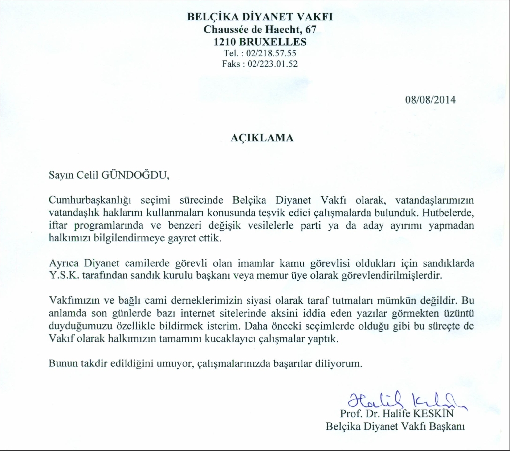 Cumhurbaşkanlığı seçim sürecinde Belçika Diyanet vakfı olarak, vatandaşlarımızın vatandaşlık haklarını kullanmaları konusunda teşvik edici çalışmalarda bulunduk. Hutbelerde, iftar programlarında ve benzeri değişik vesilelerle parti ya da aday ayrımı yapmadan halkımızı bilgilendirmeye gayret ettik.