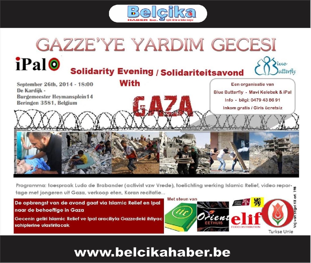 Cuma günü 26-09-2014 tarihinde saat 18:00'de Kardijk Burgemeester Heymansplein 14, 3581 Beringen adresinde yapacağımız Gazze’ye destek programına katılmanızı bekliyoruz.