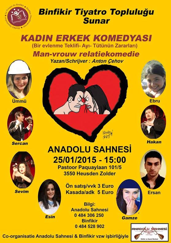 Binfikir Tiyatro Topluluğu, çağdaş dram sanatının kurucusu Anton Çehov’un kadın-erkek ilişkileri üzerine kurulu üç komedisini “Kadın-Erkek Komedyası” adıyla Brüksel'de ve Gent’te 3 kez sahneledikten sonra 25 Ocak’ta da Anadolu Sahnesi ile işbirliği içerisinde Heusden-Zolder’e taşıyor.