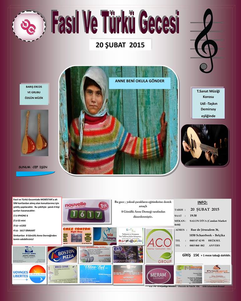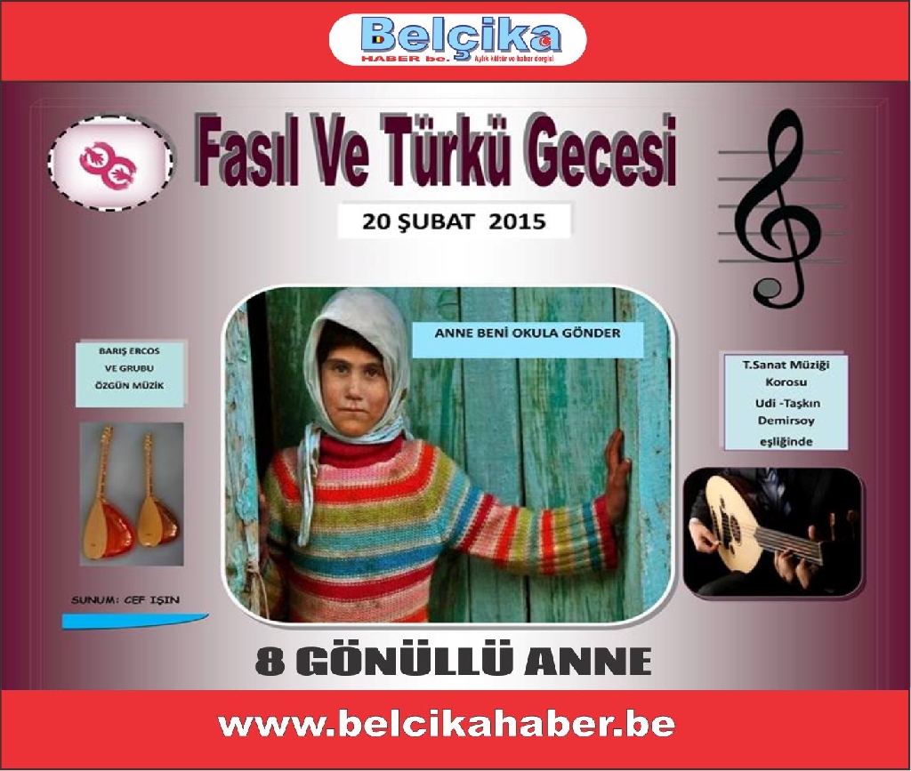 8 Gönüllü Anne Derneği yoksul çocukların eğitimine destek amacıyla 20 Şubat 2015 tarihinde Fasıl ve Türkü Gecesi düzenliyor.