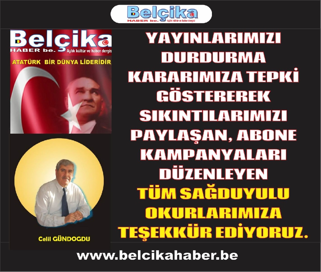 Bir çoğunuzun Belçika Türkçe yayın yapan sitelerden ve sosyal ortamdan öğrendiğiniz gibi 9 yıldan beri aralıksız yayın yapan Belçika Haber Be. Dergimizi ve 10 milyon tıklanmayı aşan www.belcikahaber.be sanal haber sitemizle ilgili yayınlarımızı maddi sıkıntılardan dolayı dün itibarıyla durdurmak zorunda kalmıştık.