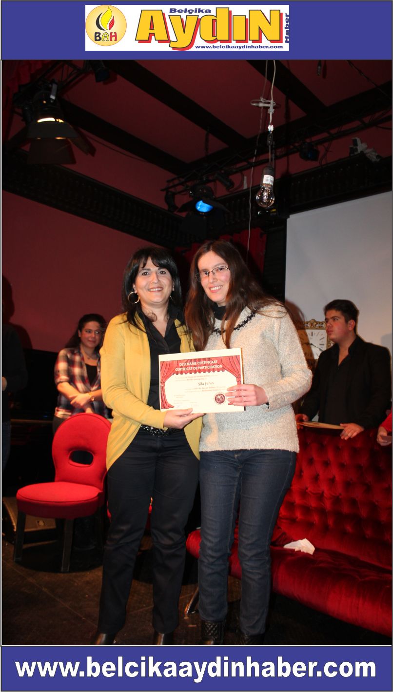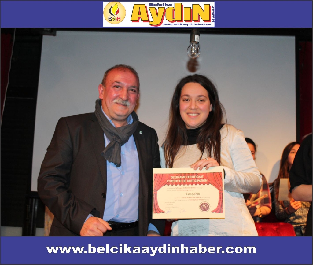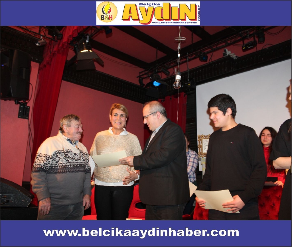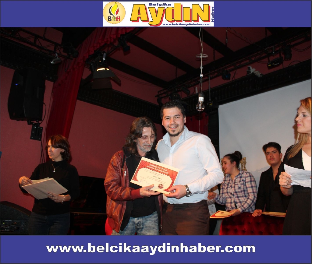T.C. Brüksel Başkonsolos’u Ali Barış Ulusoy, Schaerbeek Belediye Başkan Yardımcısı Sait Köse, Evere Belediyesi Başkan Yardımcısı Ali İnce, Evere Belediye Meclis Üyesi Belma Tek, Şair Nihat Kemal Ateş, Karikatürist Sayın İsmail Doğan, Sazznjazz Yöneticisi Ali Bağseven, Ressam Sayın Nerkiz Şahin, Mizah Yazarı ve Tiyatro Yönetmeni Erdinç Utku ve Emektar tiyatrocu Mustafa Zıngır’ın ellerinden sertifikalarını almanın heyecanını yaşadılar.