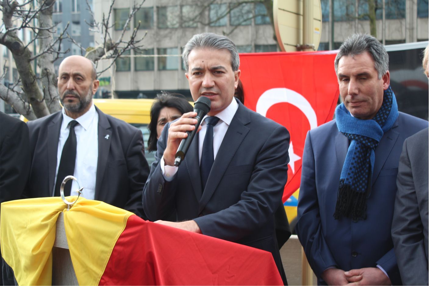 Duygulu anların yaşandığı Saint Josse Belediye Başkanı Emir Kır, Genk Belediye Başkan Yardımcısı Ali Çağlar ile UETD Belçika Şube Başkanı Basir Hamarat, teröü kınayan birer konuşma yaptılar.