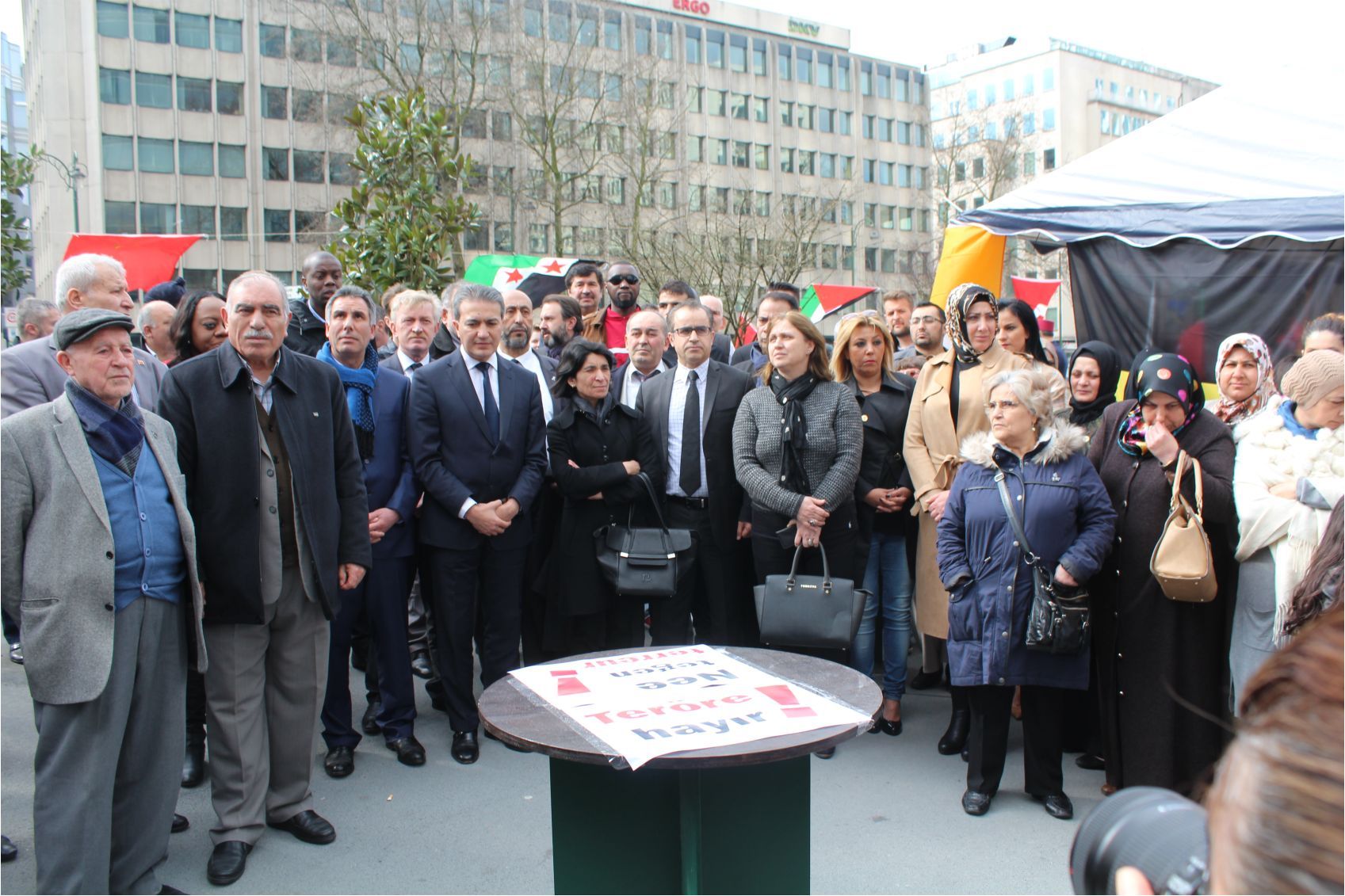 Hangi terör örgütü olursa olsun, buna pkk, pyd, daeş, işid dahil hepsinin karşısında olduğumuzu burada ifade ediyoruz.Millet, Din, dil,yapılmadan terörü lanetliyoruz. Acı her dilde aynıdır.İnsan her dinde kutsaldır.Huzurda her milletin hayalidir. AB terör listesinde olan bir terör örgütünün sempatizanlarına AB’nin kalbi Brüksel’de çadır kurdurup, onlara propaganda imkanı sağlayanlarıda şiddetle kınıyoruz. Bunun fikir ve ifade özgürlüğü ilede alakası yoktıur.