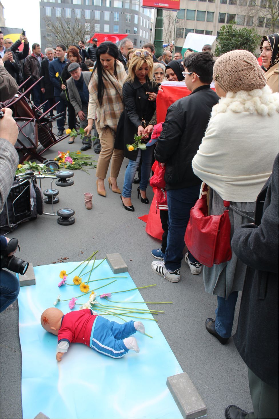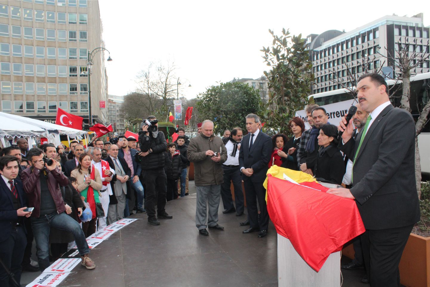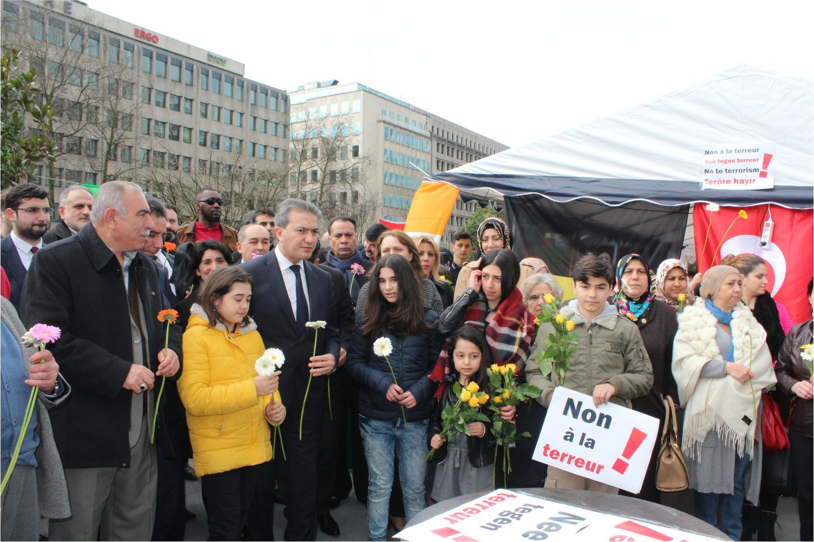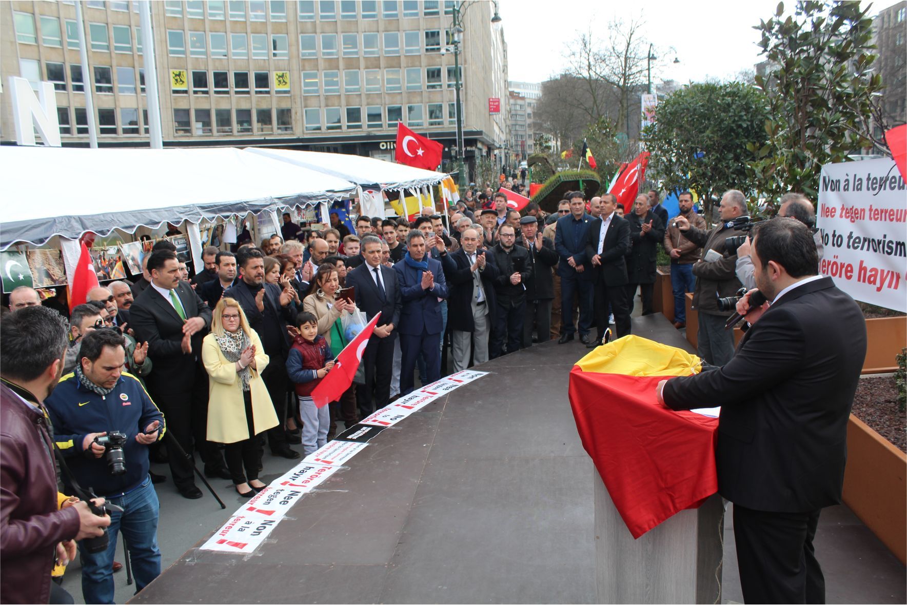 Federal Milletvekili ve Saint Josse Belediye Başkanı Emir Kır'ın izin verdiği ve sorumluluk sınırları içerisinde kurulan 'Terörü lanetleme ve terör kurbanlarını anma çadırındaki programa, Başkan Emir Kır'ın yanında Saint Josse Belediye Başkan Yardımcıları, Meclis Üyeleri ve kalabalık davetli katıldı. Konuşmalar öncesi terör kurbanları anısına sembolik terör sahnesine çiçekler bırakılarak, saygı duruşu yapıldı.