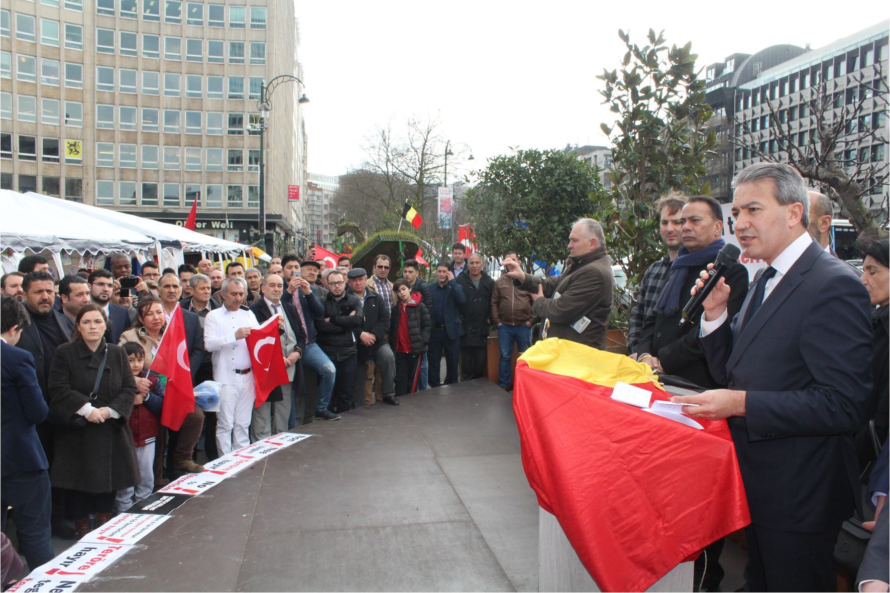 Bu yüzden biz avrupanın merkezi olan Brüksel’de Avrupa’lı Türk’ler olarak bugün teröre karşı Place Madou meydanında çadırımızı kurduk.Türkiye ve diğer ülkelerde teröre kurban gidenlerin acısını paylaşıyoruz.Burada biz Türkler olarak teröre şiddetle karşı olduğumuzu ve bugüne kadar Türkiye’nin hiç bir zaman terör ile yanyana olmadığını ifade ediyoruz.
