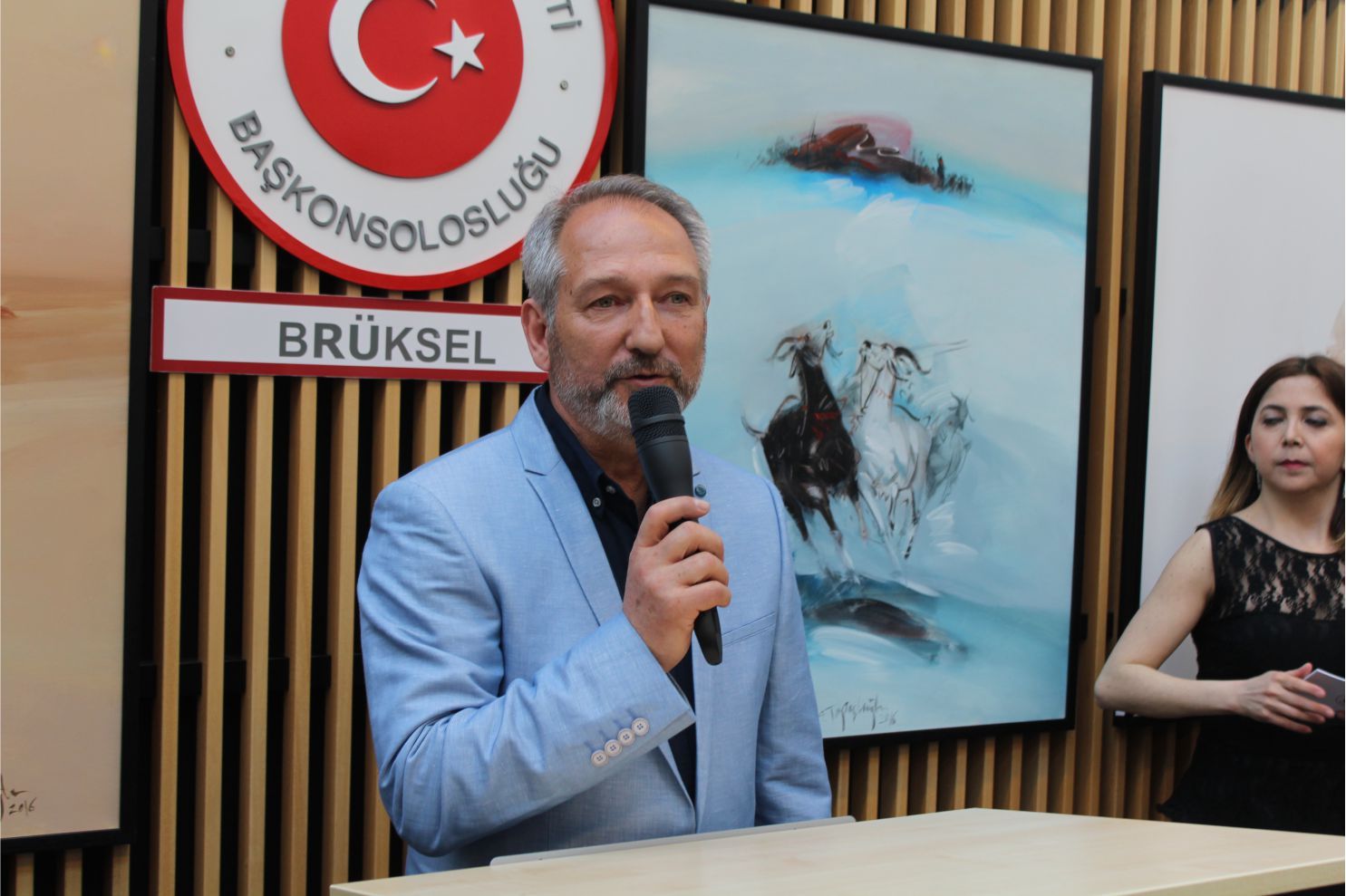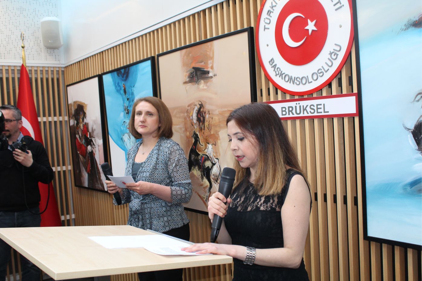 50’ye yakın kişisel sergisini açan Ressam Akdoğan Topaçlıoğlu ise yaptığı konuşmada, “ T.C. Brüksel Başkonsolosluğu’nun 50. hizmet yılı çerçevesinde düzenlenen etkinliklerde benim de eserlerimin sergilenmesinden duyduğum mutluluğumu ifade etmek isterim. Sizlerle birlikte olmaktan hem heyecan , hem onur duyuyorum. Bu sergiye katkıda bulunan ve bana bu fırsatı veren Başkonsolosumuz Sayın Ali Barış Ulusoy beyefendiye ve Esin Ulusoy Hanımefendiye çok teşekkür ediyorum” dedi.