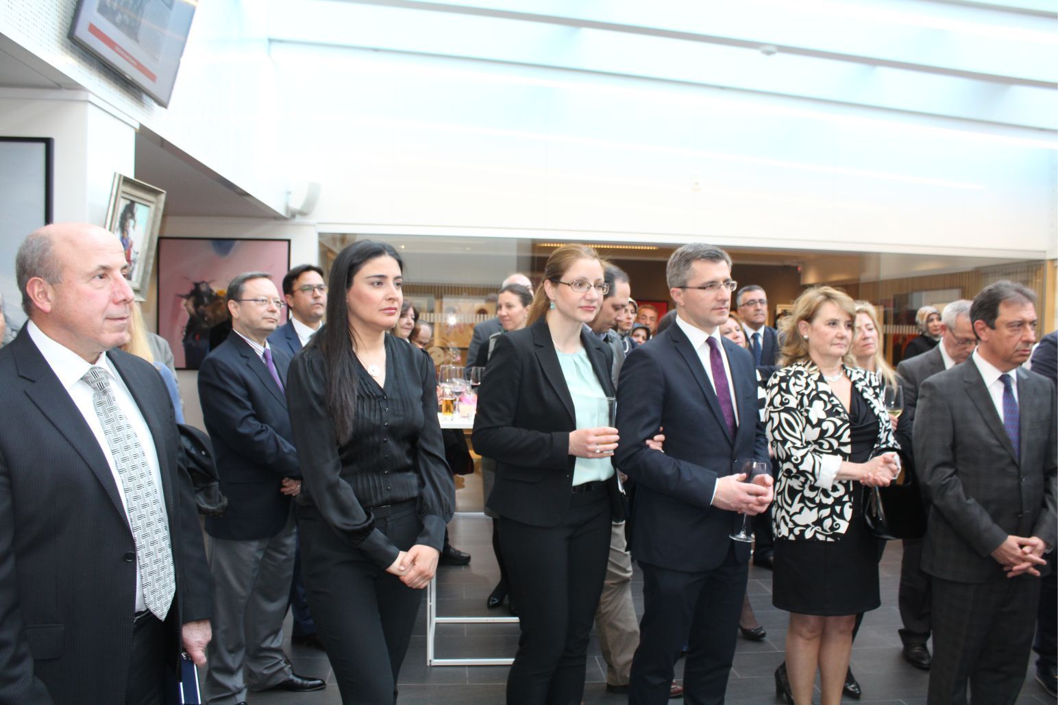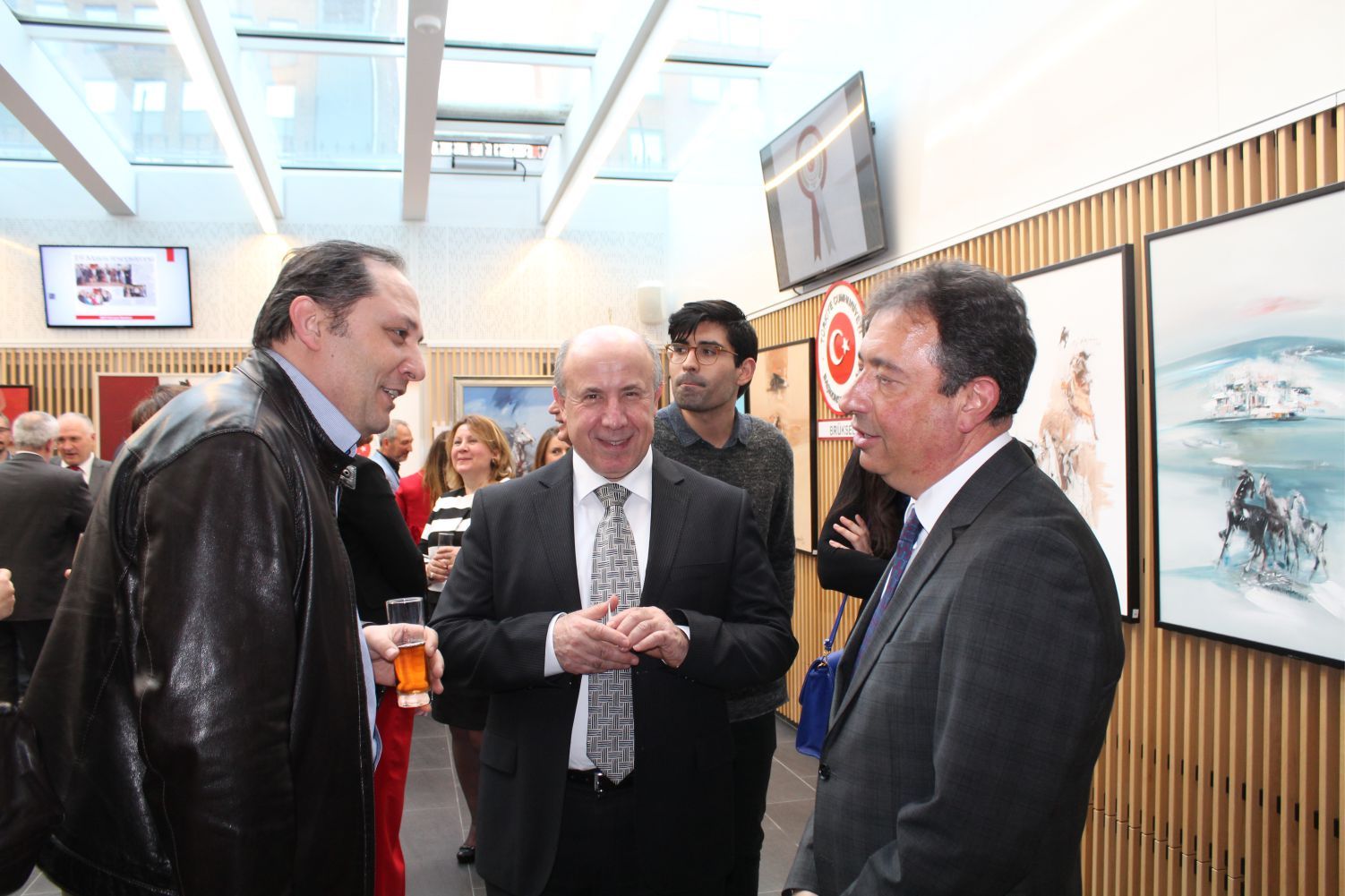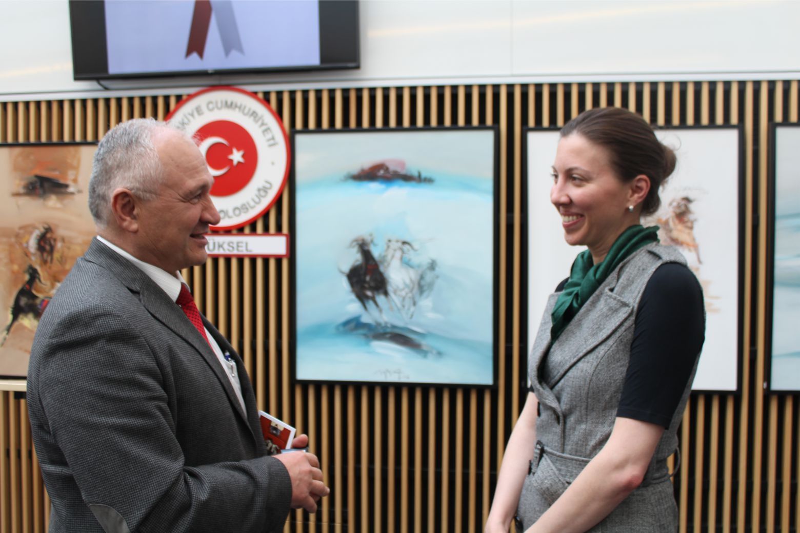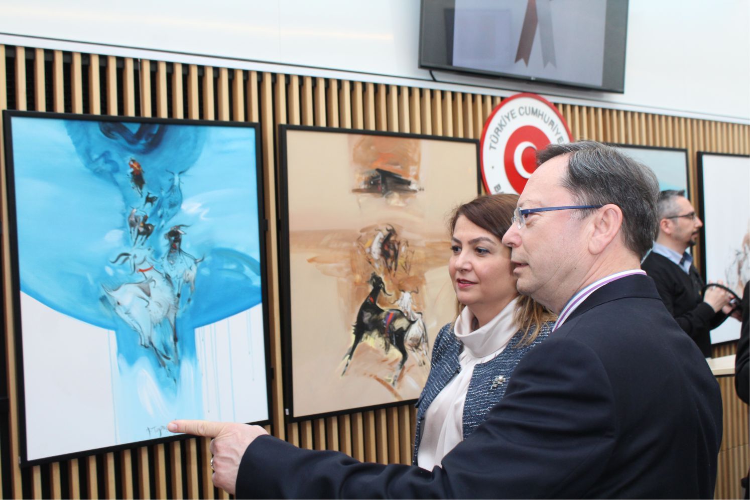 Büyükelçilik Eski çalışanlarımızdan Eski Büyükelçi Kaya İnal ve terör nedeniyle yaşamlarını yitiren şehitlerimiz ve vatandaşlarımızı rahmetle anıyoruz. Hain saldırıları şiddetle kınıyor, yaşamlarını yitirenlere Allah’tan rahmet diliyorum. Bu vesileyle, Ressam Sayın Topaçlıoğlu’na, Dışişleri bakanlığımıza ve THY çok teşekkür ediyorum, siz sanatseverlere hayırlı akşamlar diliyorum “dedi.