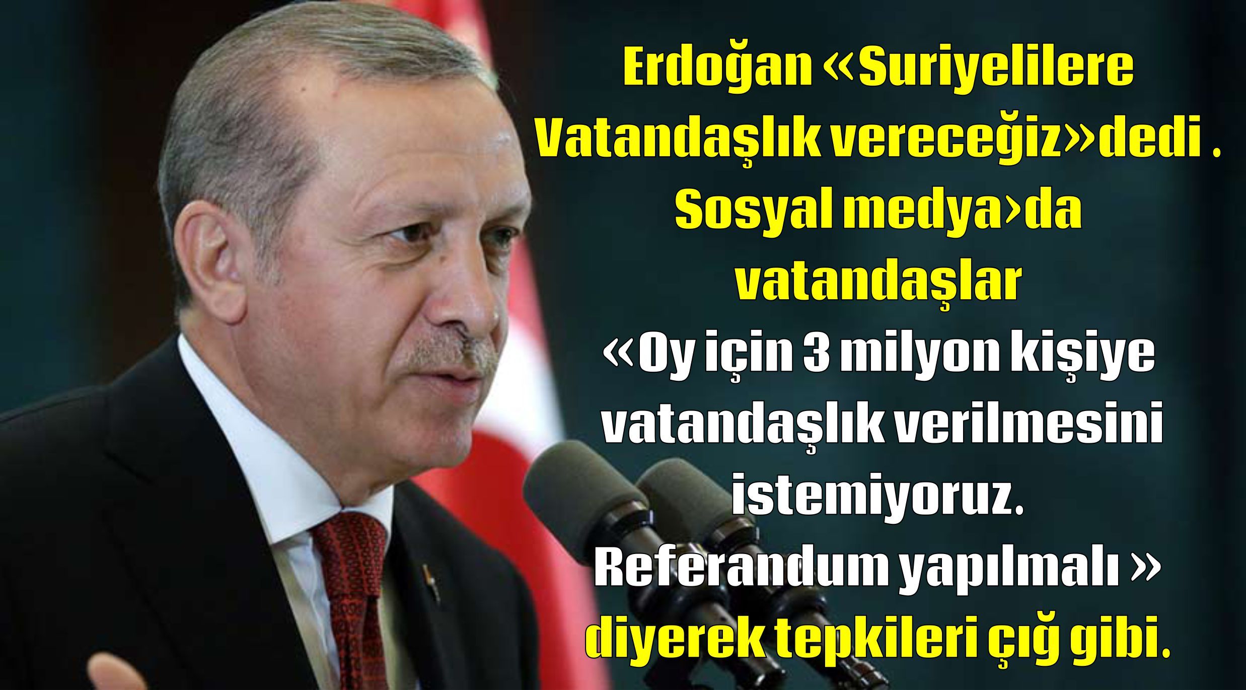 Erdoğan'ın bu sözü, sosyal medyada tartışma konusu olurken, bazı Twitter kullanıcıları Suriyeliler'in artık oy kullanabileceklerini hatırlatarak vatandaşlığın bu nedenle verildiğini iddia etti. haber sonbrası sosyal medya'da tepkiler yükselmeye başladı. "Biz zar zor geçinirken 3,5 milyon Suriyeli'ye oy için vatandaşlık veriliyor. Bizler zaten zor şartlarda yaşıyoruz. Ya bunların içerisindeki teröristler onlar vatandaşlık aldığında bizlerde huzur kalmayacak. Bu çılgın bir karardır. Suriyelilerin vatandaşlığını istemiyoruz" dediler.