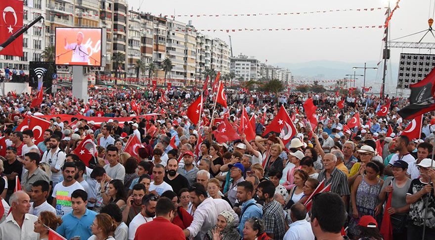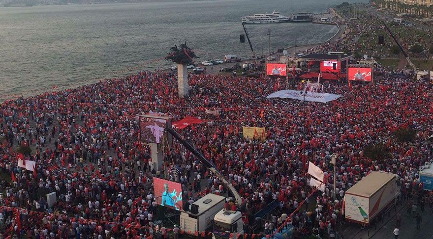 CHP ilkini İstanbul Taksim Meydanı’nda yaptığı cumhuriyet ve demokrasi mitinglerinden ikincisini İzmir Alsancak’ta Gündoğdu Meydanı’nda yaptı. Cumhuriyet ve Demokrasi Mitingi’nde vatandaşların ellerinde taşıdığı Türk bayraklarıyla alan, ‘gelincik tarlasına’ döndü. Kılıçdaroğlu, sırtını İzmir Limanı’na yüzünü Cumhuriyet Meydanı’na dönerek, konuştu. Mitinge Başbakan Binali Yıldırım dışındaki AK Parti’nin milletvekillerinin tamamı ile AK Parti İzmir İl Başkanı Bülent Delican da katıldı. Mitinge polisten alınan bilgiye göre 45 bin, partililere göre ise 200 bin kişinin katıldığı öne sürüldü.