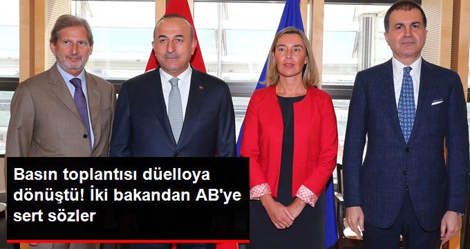 AB Bakanı Çelik, Dışişleri Bakanı Çavuşoğlu ile AB yetkilileri Mogherini ve Hahn arasında Brüksel'de gerçekleşen zirvenin ardından yapılan basın toplantısı gergin anlara sahne oldu. Türkiye'ye yönelik haksız eleştirilere iki bakan sert cevap verdi.