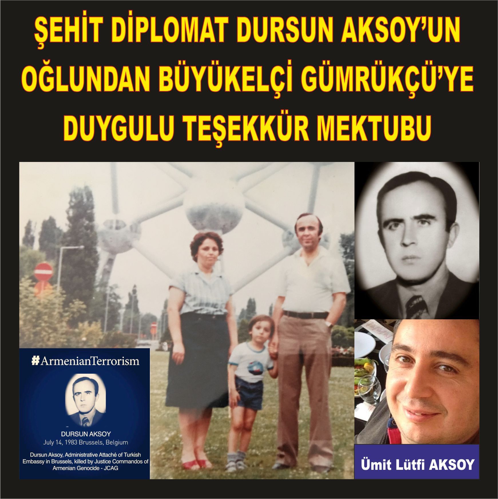 14 Temmuz 1983 yılında Brüksel Büyükelçiliği Ataşesi olarak görev yaptığı sırada 39 yaşında evli ve üç çocuk babası iken, evinden işine gitmek için aracına bindiği sırada kurulan hain bir pusu sonucu Asala Ermeni terör örgütü’nce gerçekleştirilen menfur bir saldırıda şehit edilen babam Şehit Dursun Aksoy'un adının, Brüksel Büyükelçiliği binasındaki bir salona verilmesi, şahsım ve ailemi ziyadesiyle duygulandırmış ve mesut etmiştir.