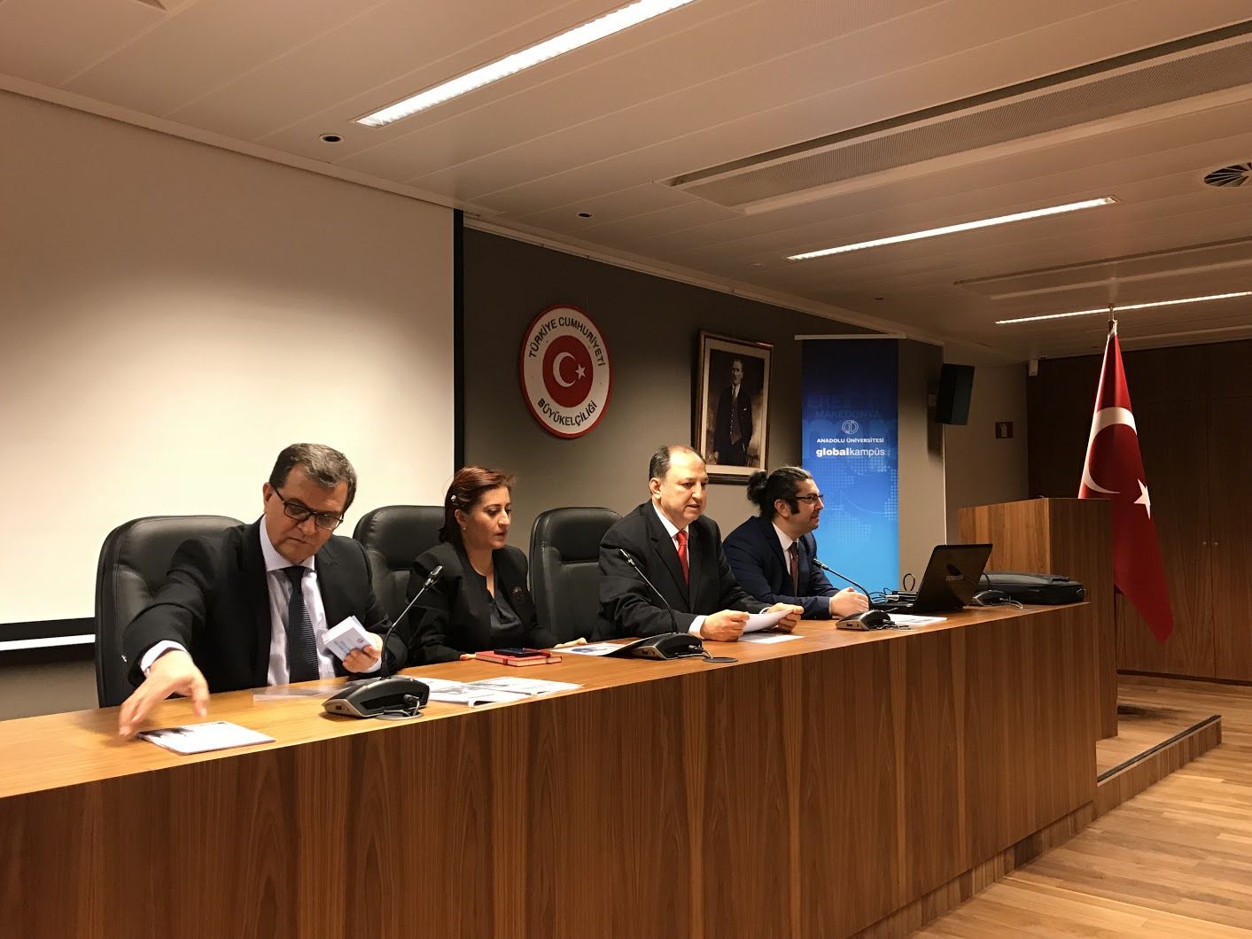 T.C. Büyükelçiliği Şehit Diplomat Dursun Aksoy Toplantı Salonunda yapılan bilgilendirme toplantısında katılımcıların sorularını T.C. Brüksel Başkonsolosu Dilşad Kırbaşlı Karaoğlu, Eğitim Müşavir Vekili Ali Özgür ile Anadolu Üniversitesi Öğretim Üyesi Dr. Ahmet Atilla Doğan ve Selahatdin Tarhan cevaplamışlardır. Anadolu Üniversitesi Batı Avrupa Programları Koordinatörlüğü ile T.C. Brüksel Büyükelçiliği Eğitim Müşavirliği işbirliğinde düzenlenen Batı Avrupa’da Açıköğretim Fırsatları’’ bilgilendirme toplantısına öğretmenler ve vatandaşlar katılmıştır.