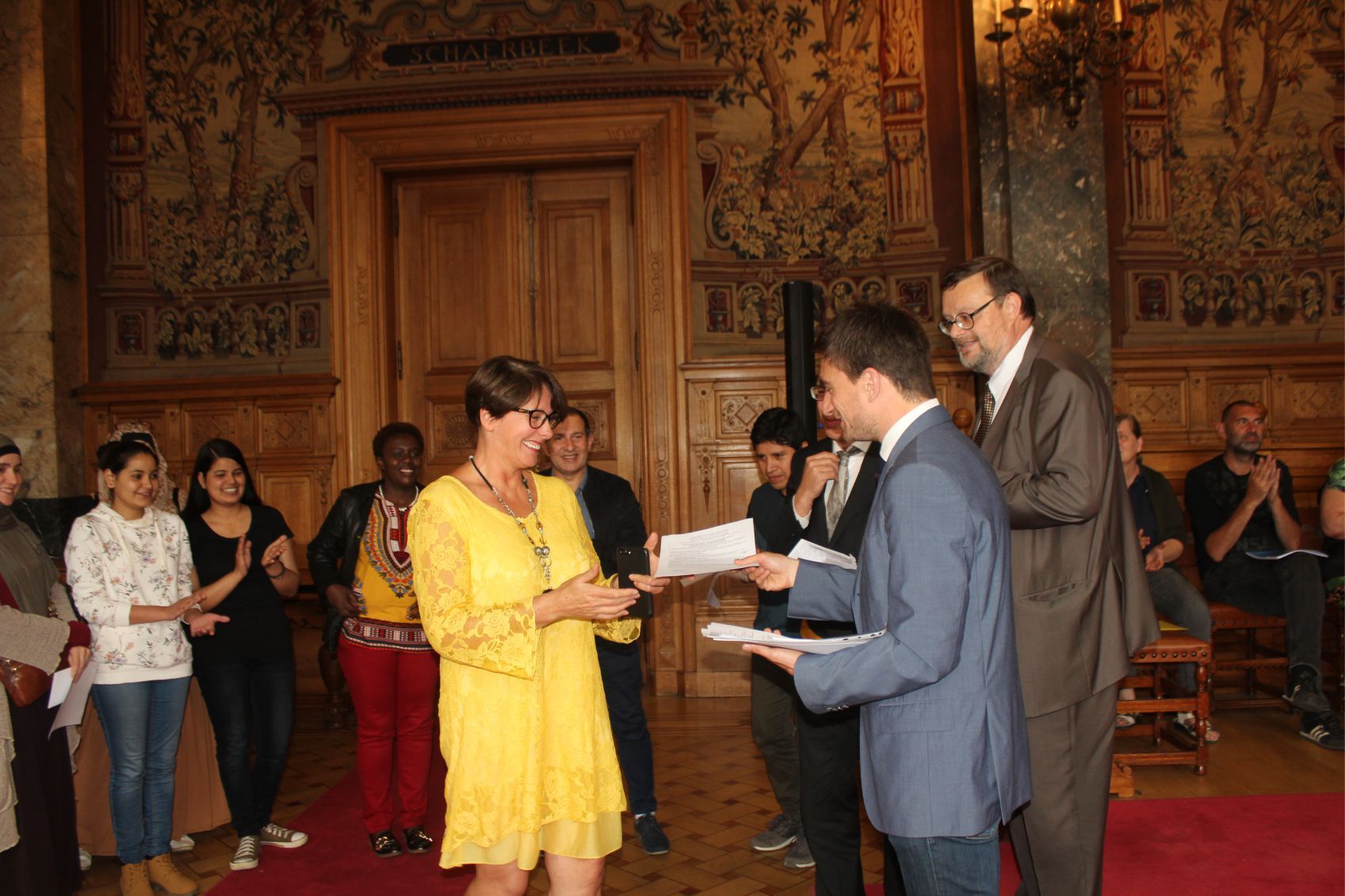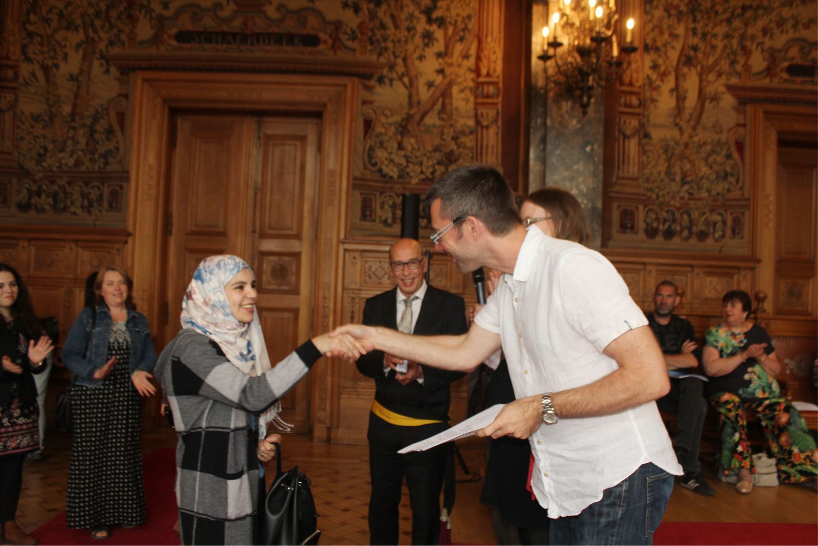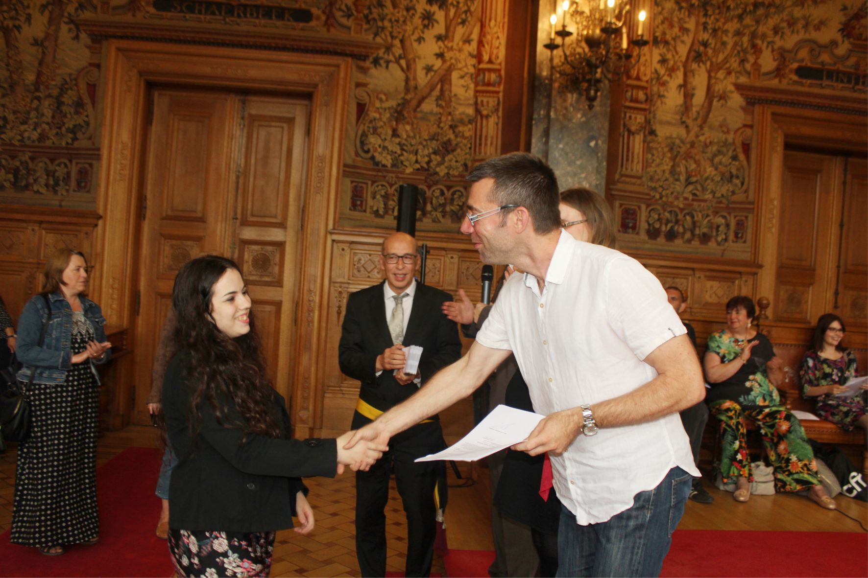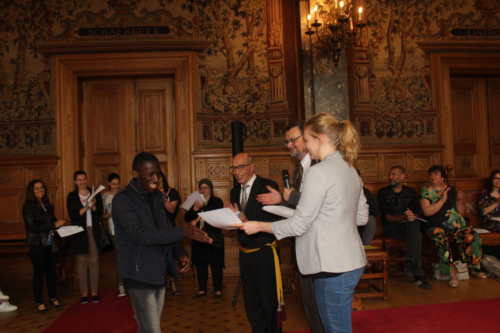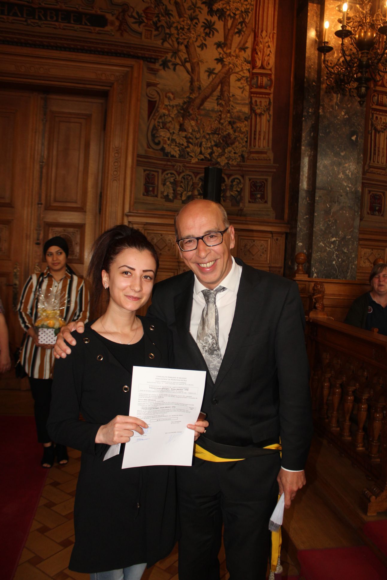 Schaerbeek belediye salonunda gerçekleştirilen sertfika töreninde, Schaerbeek belediyesi Eğitim’den sorumlu başkan yardımcısı Michel De Herde, Ecole de Promotion Social de Schaerbeek Direktörü Jean Louis Brismee ve kurs hocaları birlikte sertfikaları kursiyerlere takdim ettiler.