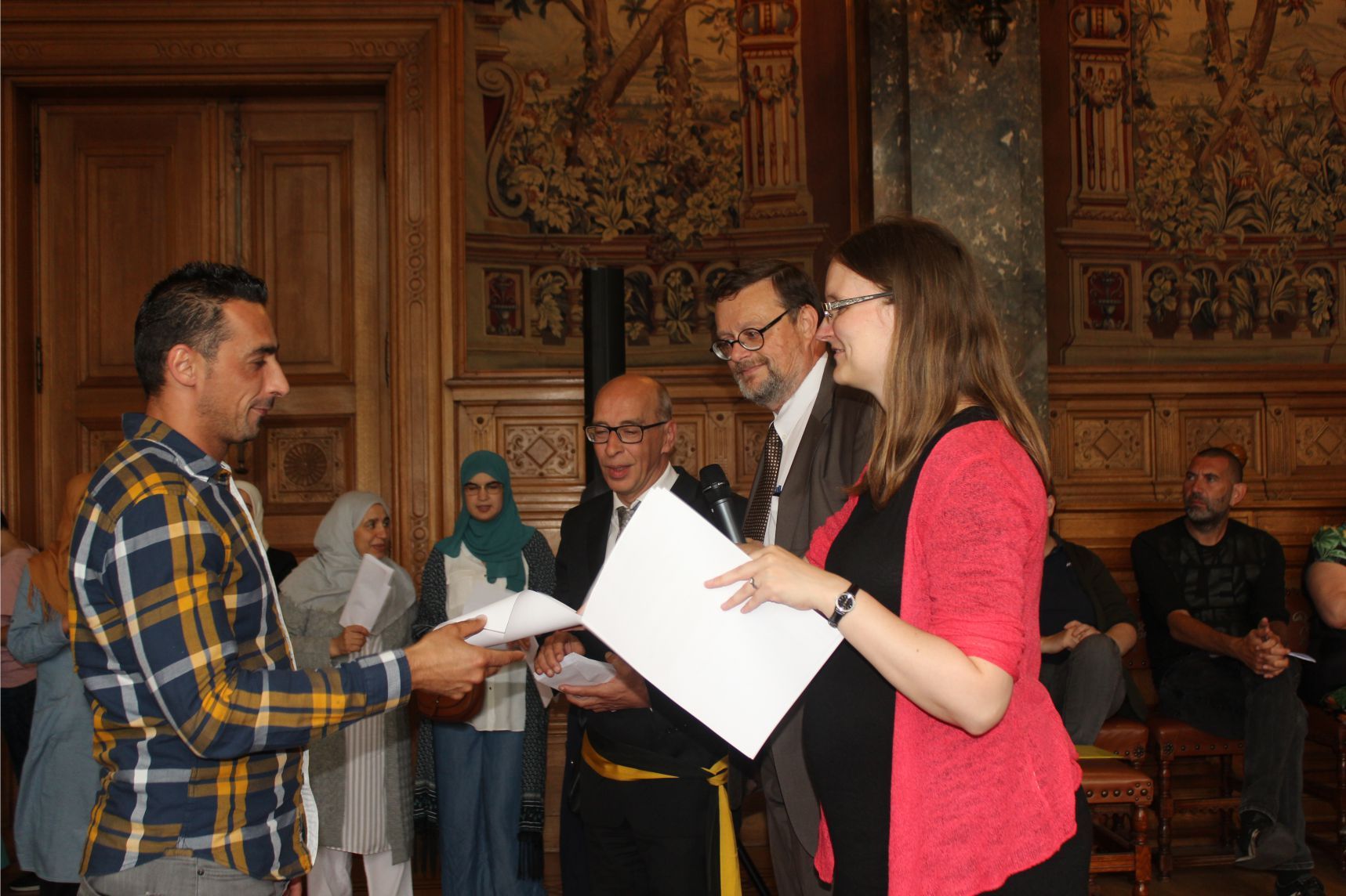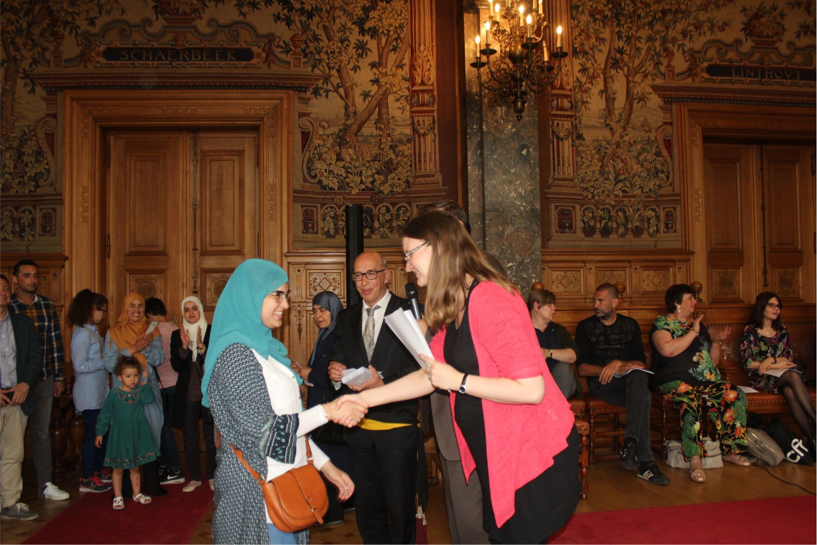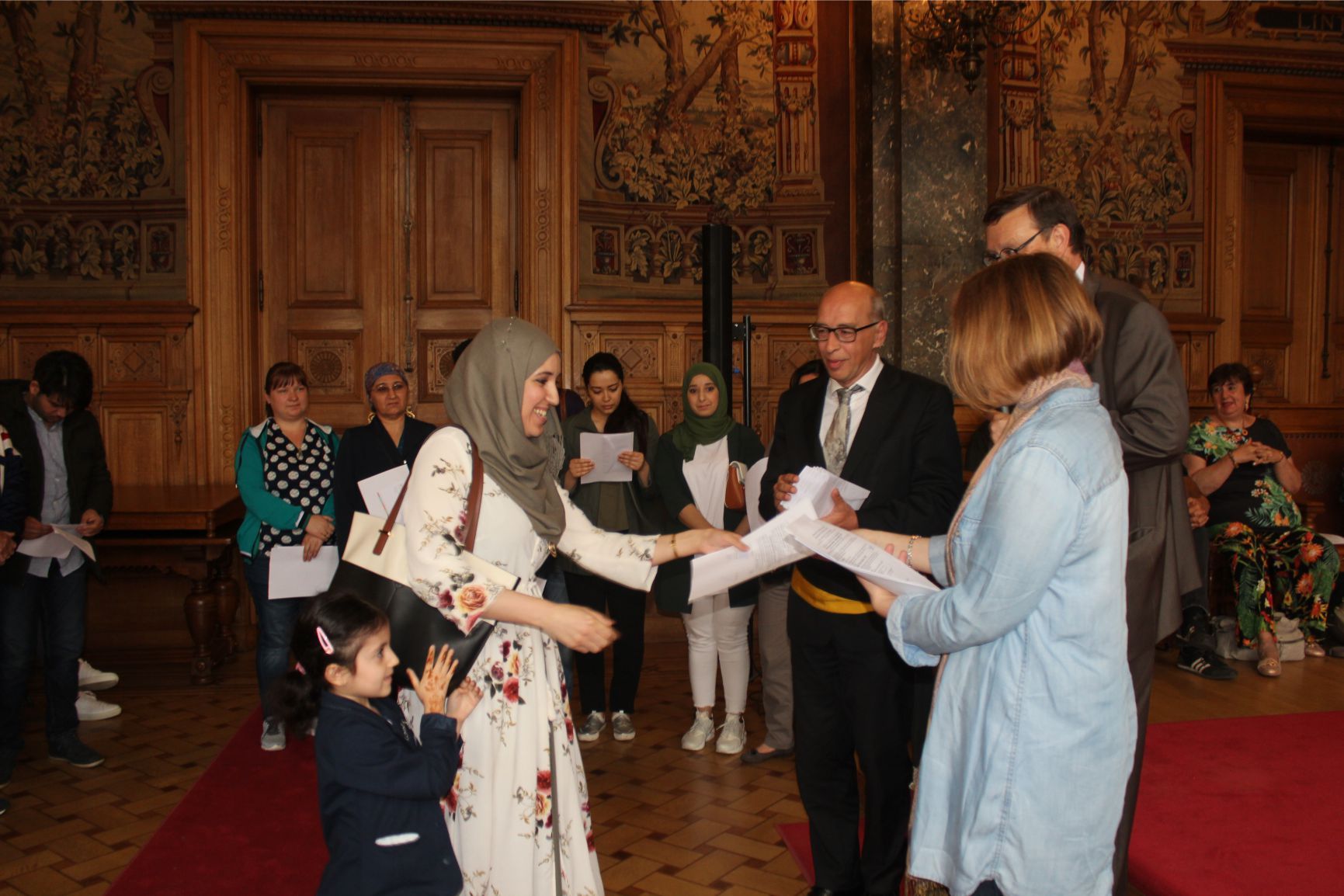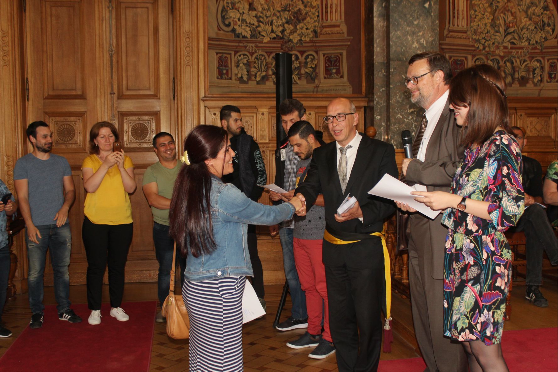Schaerbeek belediye salonunda gerçekleştirilen sertfika töreninde, Schaerbeek belediyesi Eğitim’den sorumlu başkan yardımcısı Michel De Herde, Ecole de Promotion Social de Schaerbeek Direktörü Jean Louis Brismee ve kurs hocaları birlikte sertfikaları kursiyerlere takdim ettiler.