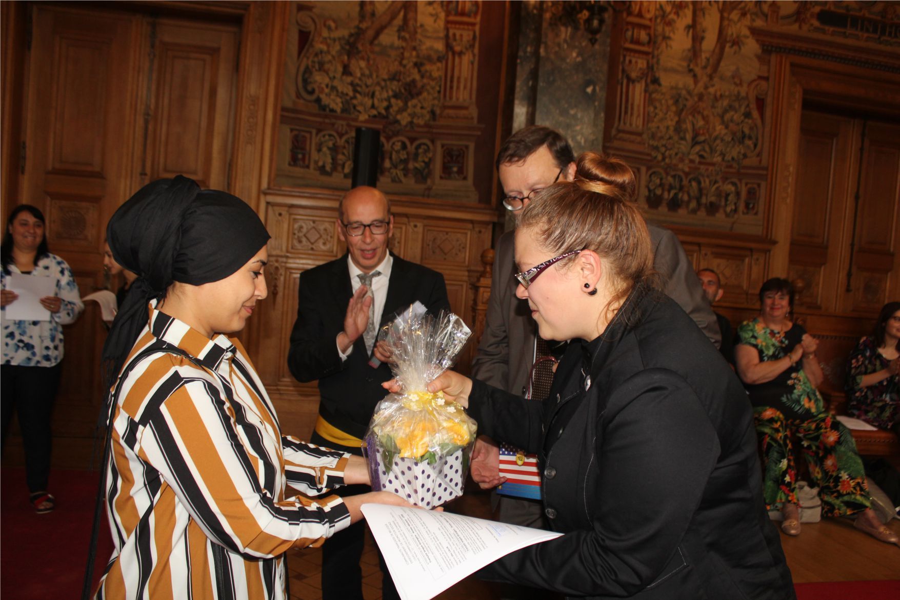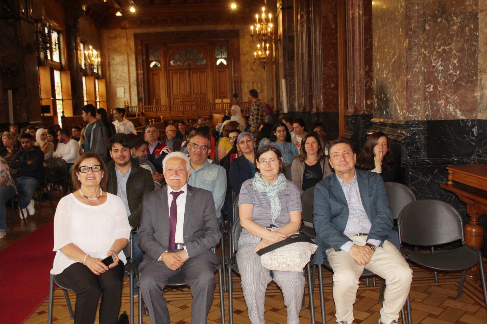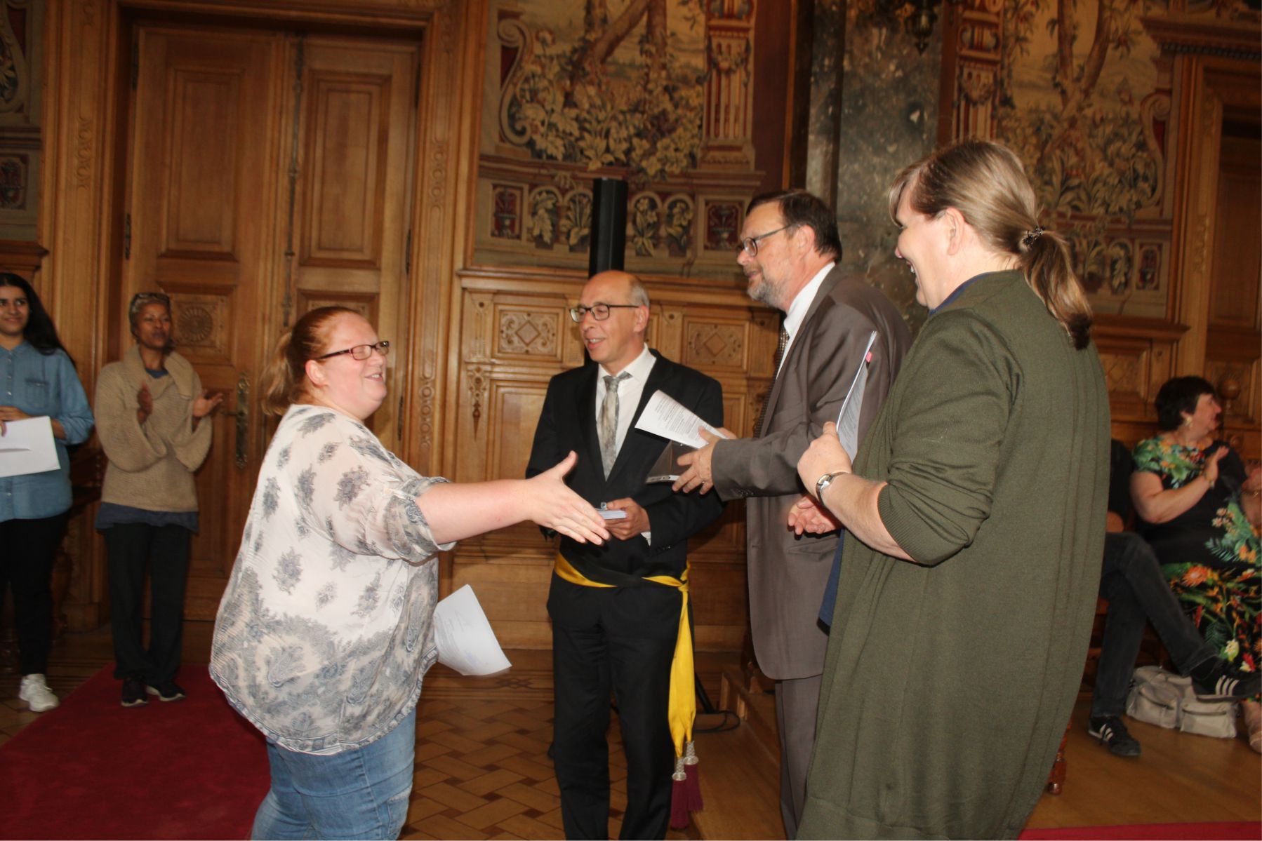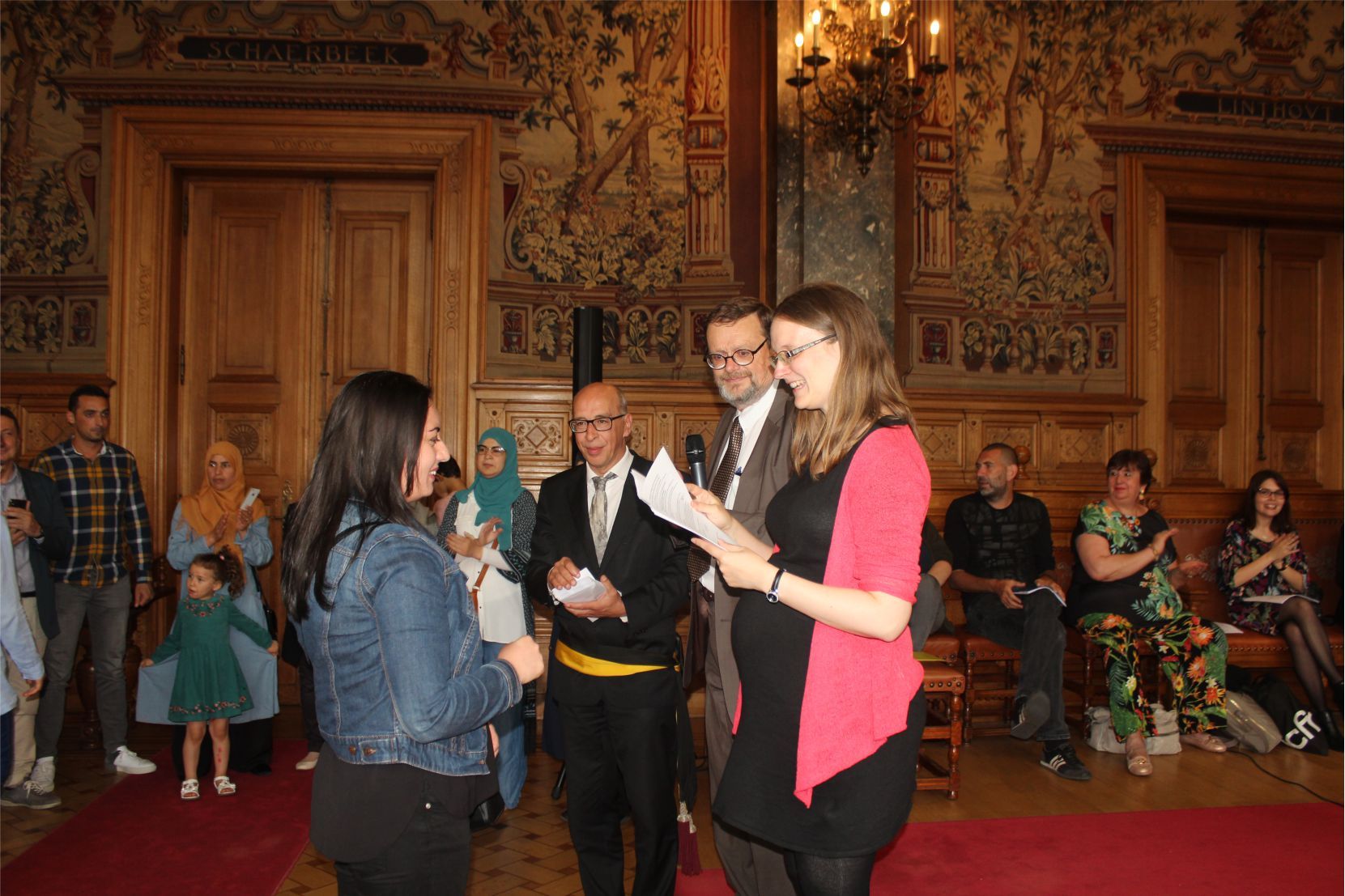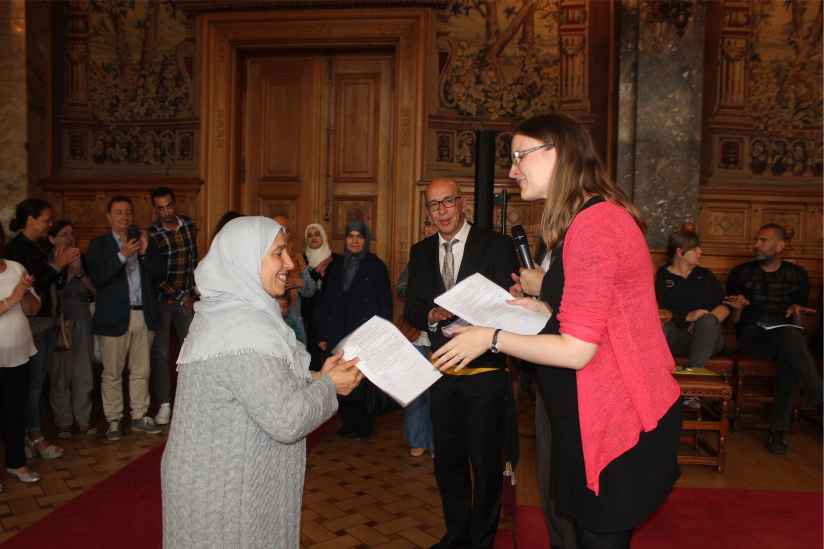 Schaerbeek belediye salonunda gerçekleştirilen sertfika töreninde, Schaerbeek belediyesi Eğitim’den sorumlu başkan yardımcısı Michel De Herde, Ecole de Promotion Social de Schaerbeek Direktörü Jean Louis Brismee ve kurs hocaları birlikte sertfikaları kursiyerlere takdim ettiler.