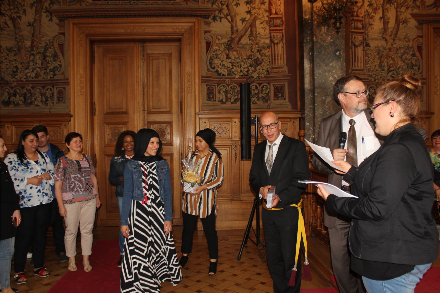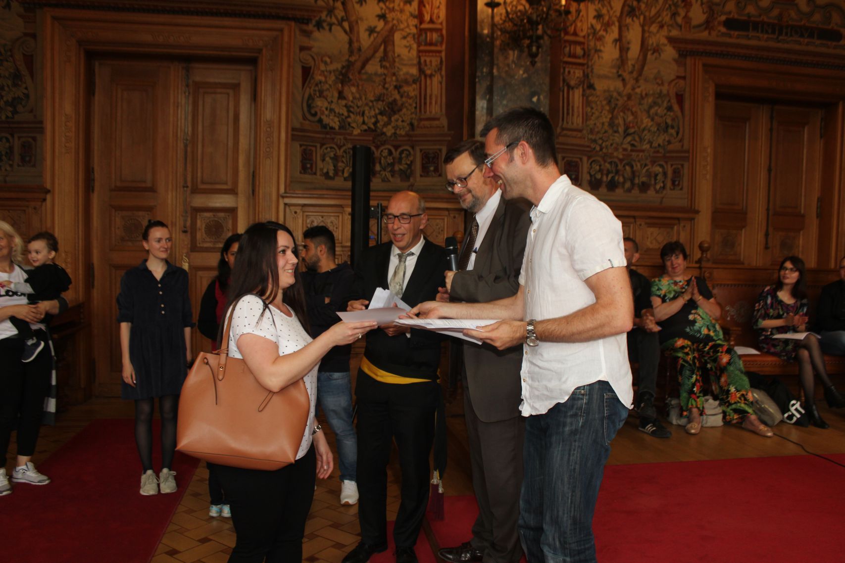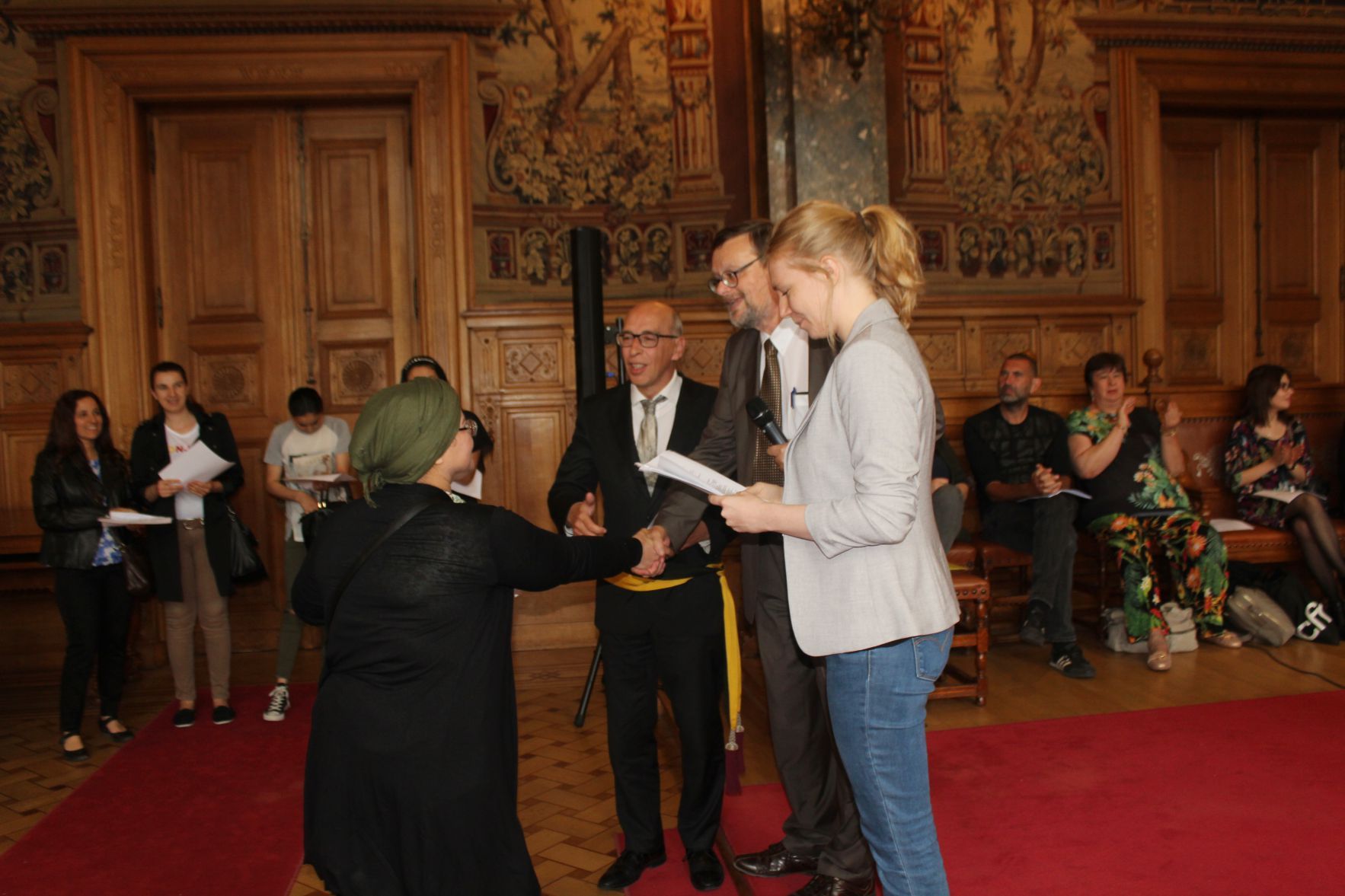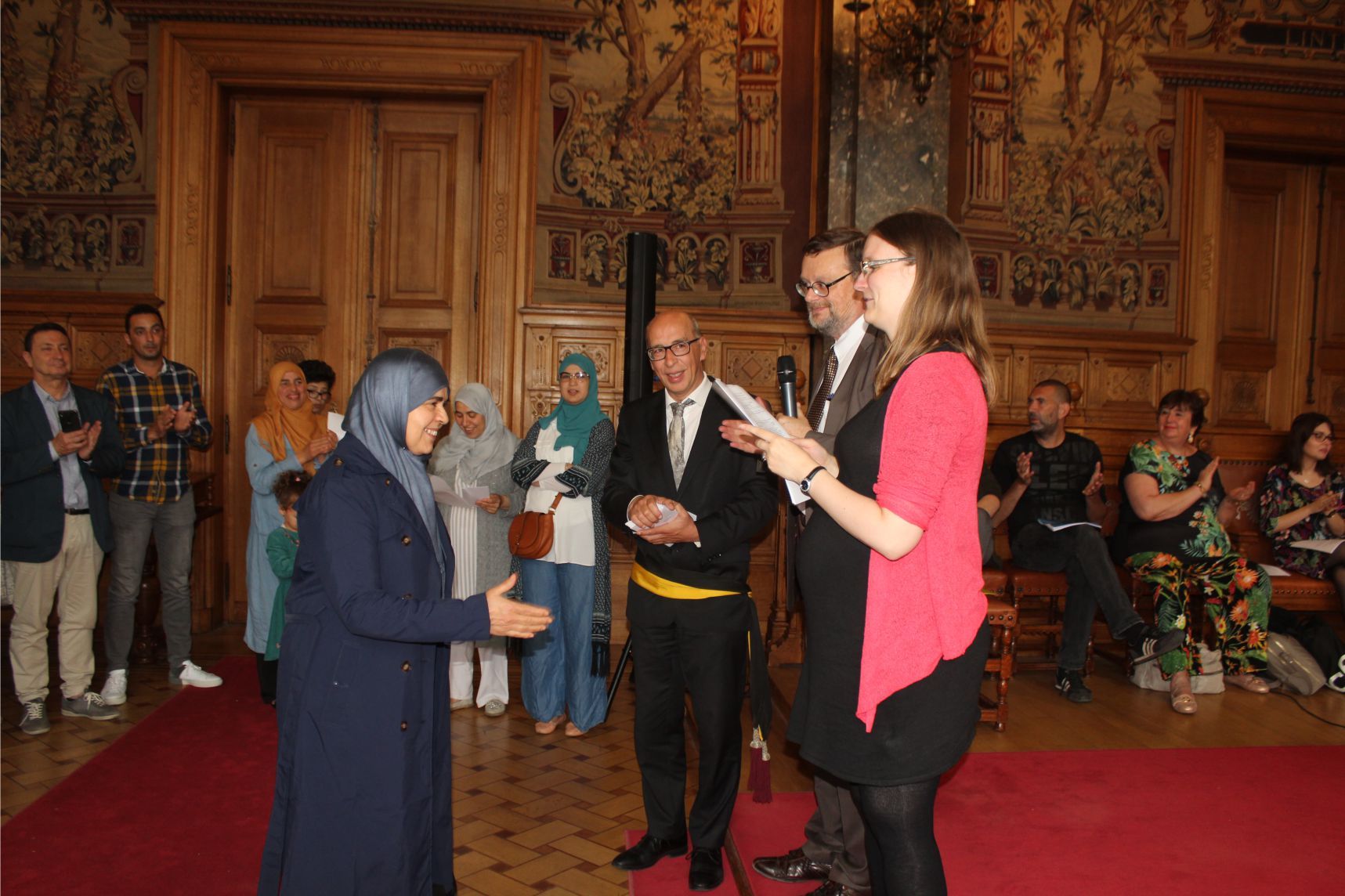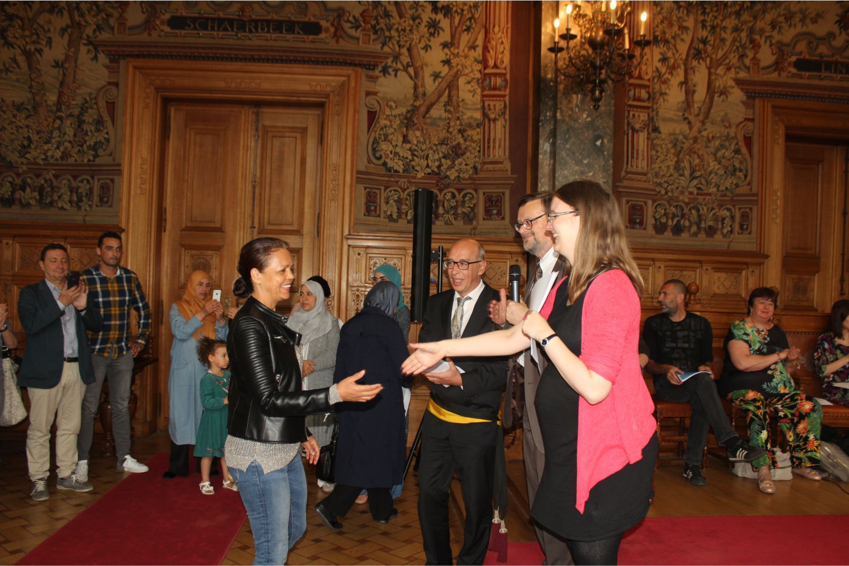 Schaerbeek belediye salonunda gerçekleştirilen sertfika töreninde, Schaerbeek belediyesi Eğitim’den sorumlu başkan yardımcısı Michel De Herde, Ecole de Promotion Social de Schaerbeek Direktörü Jean Louis Brismee ve kurs hocaları birlikte sertfikaları kursiyerlere takdim ettiler.