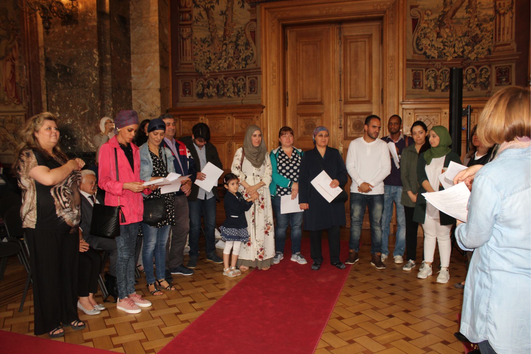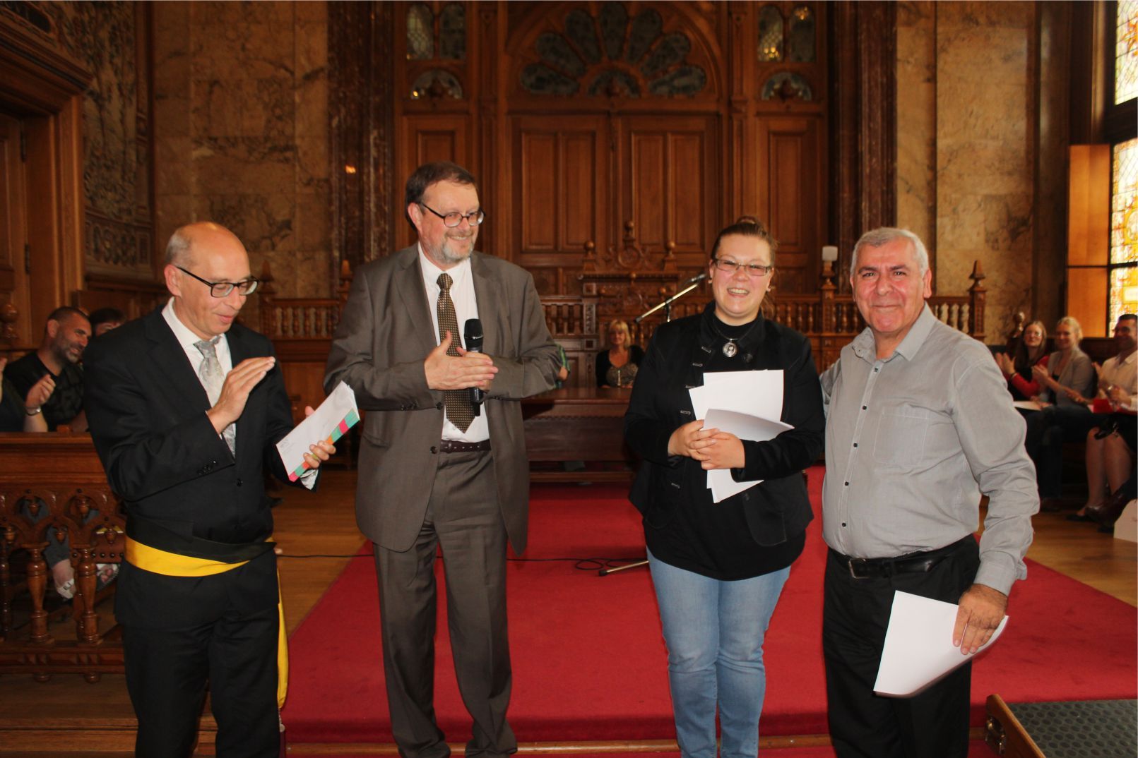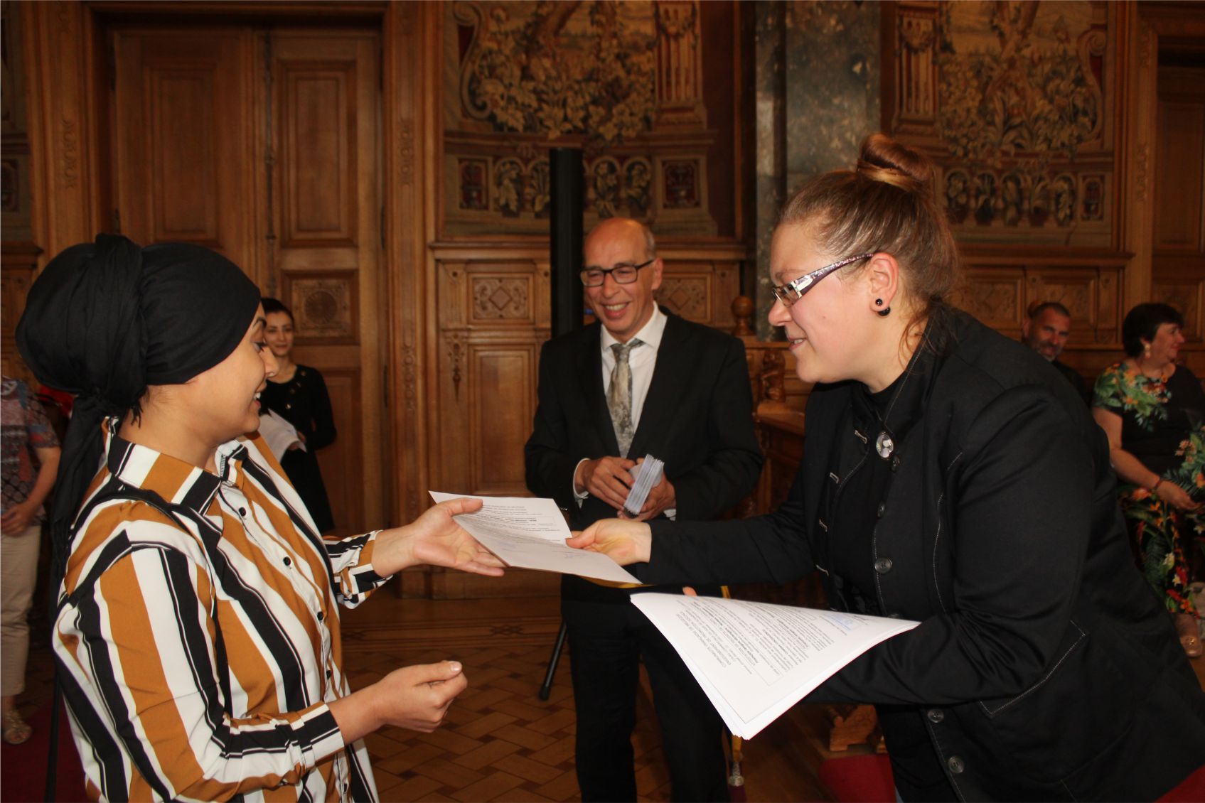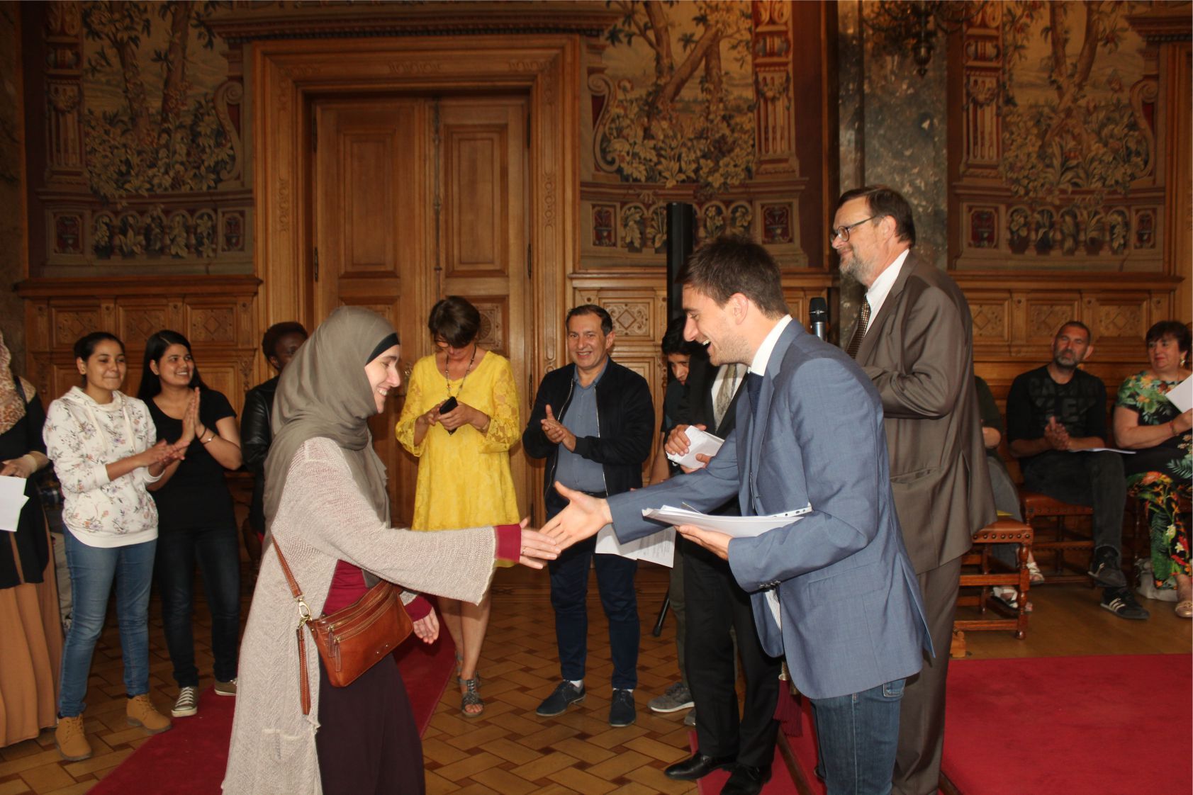 Schaerbeek belediye salonunda gerçekleştirilen sertfika töreninde, Schaerbeek belediyesi Eğitim’den sorumlu başkan yardımcısı Michel De Herde, Ecole de Promotion Social de Schaerbeek Direktörü Jean Louis Brismee ve kurs hocaları birlikte sertfikaları kursiyerlere takdim ettiler.