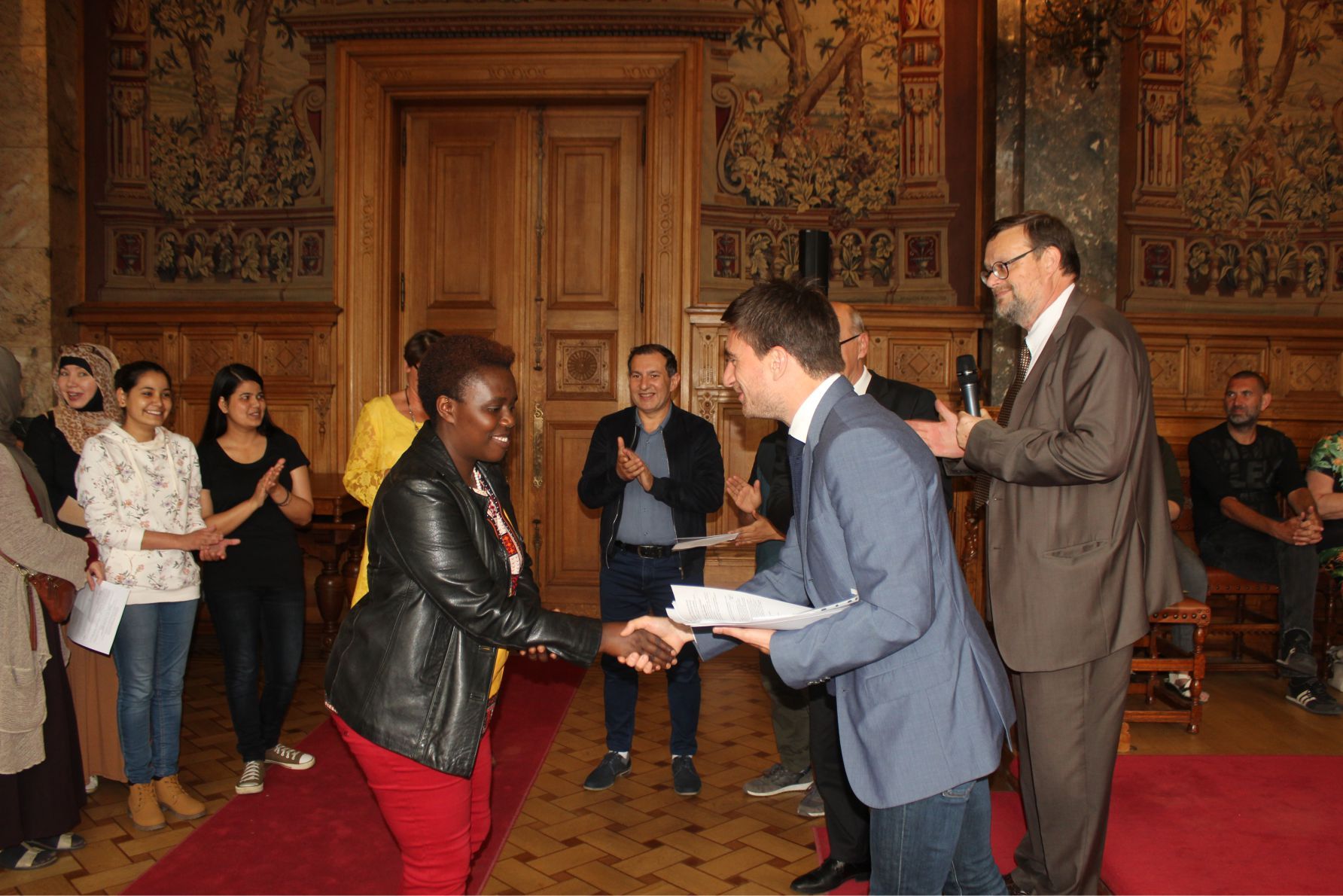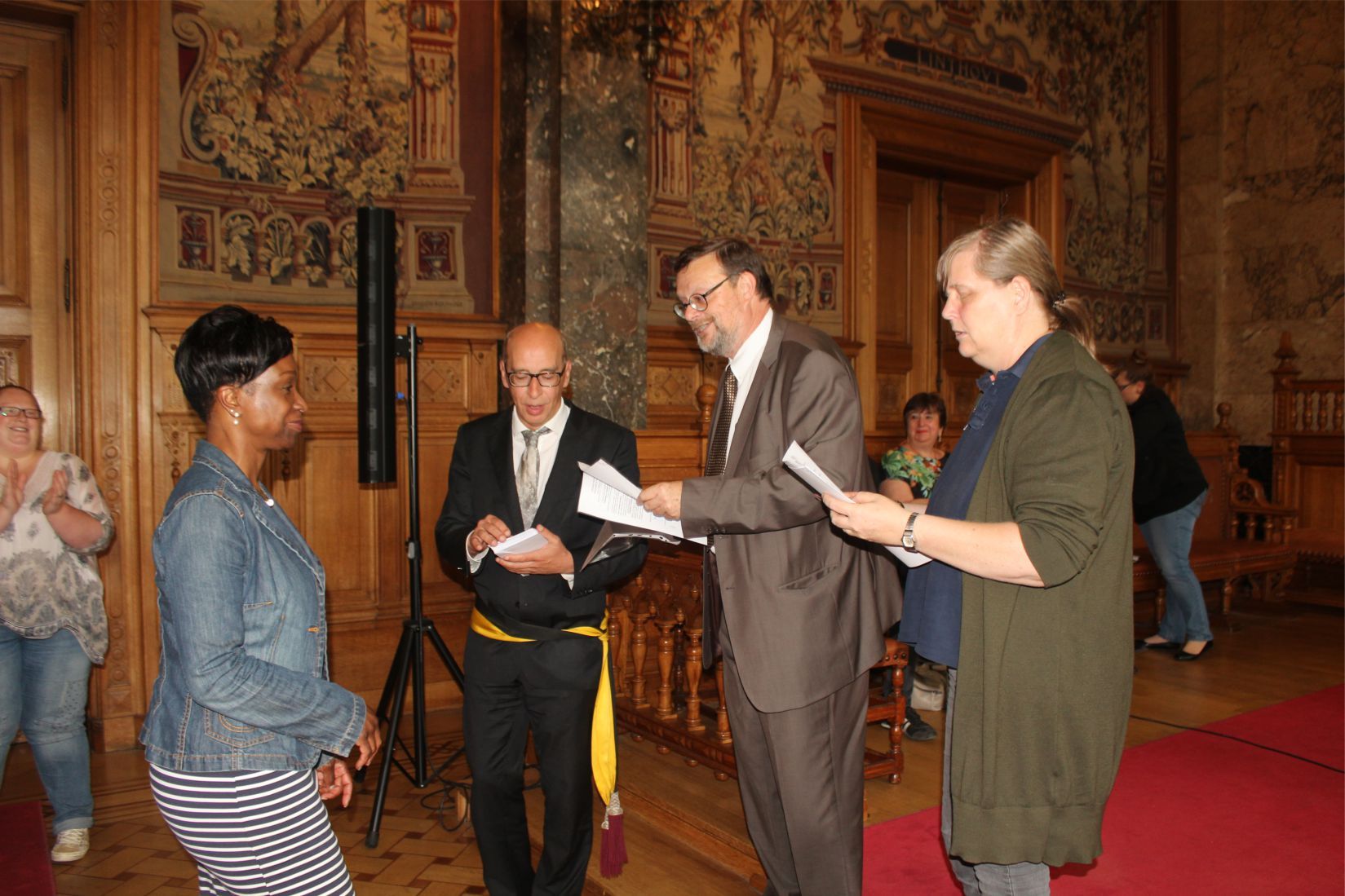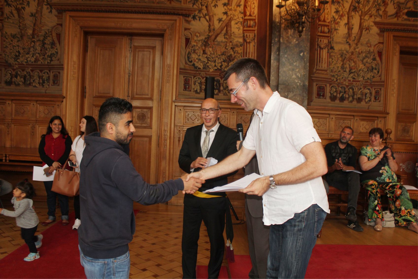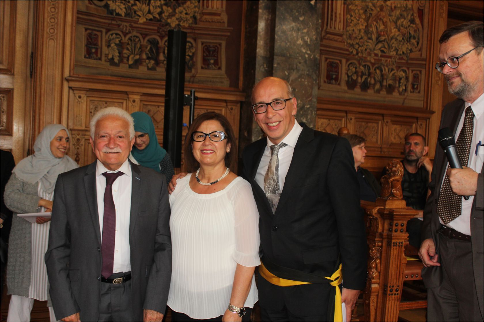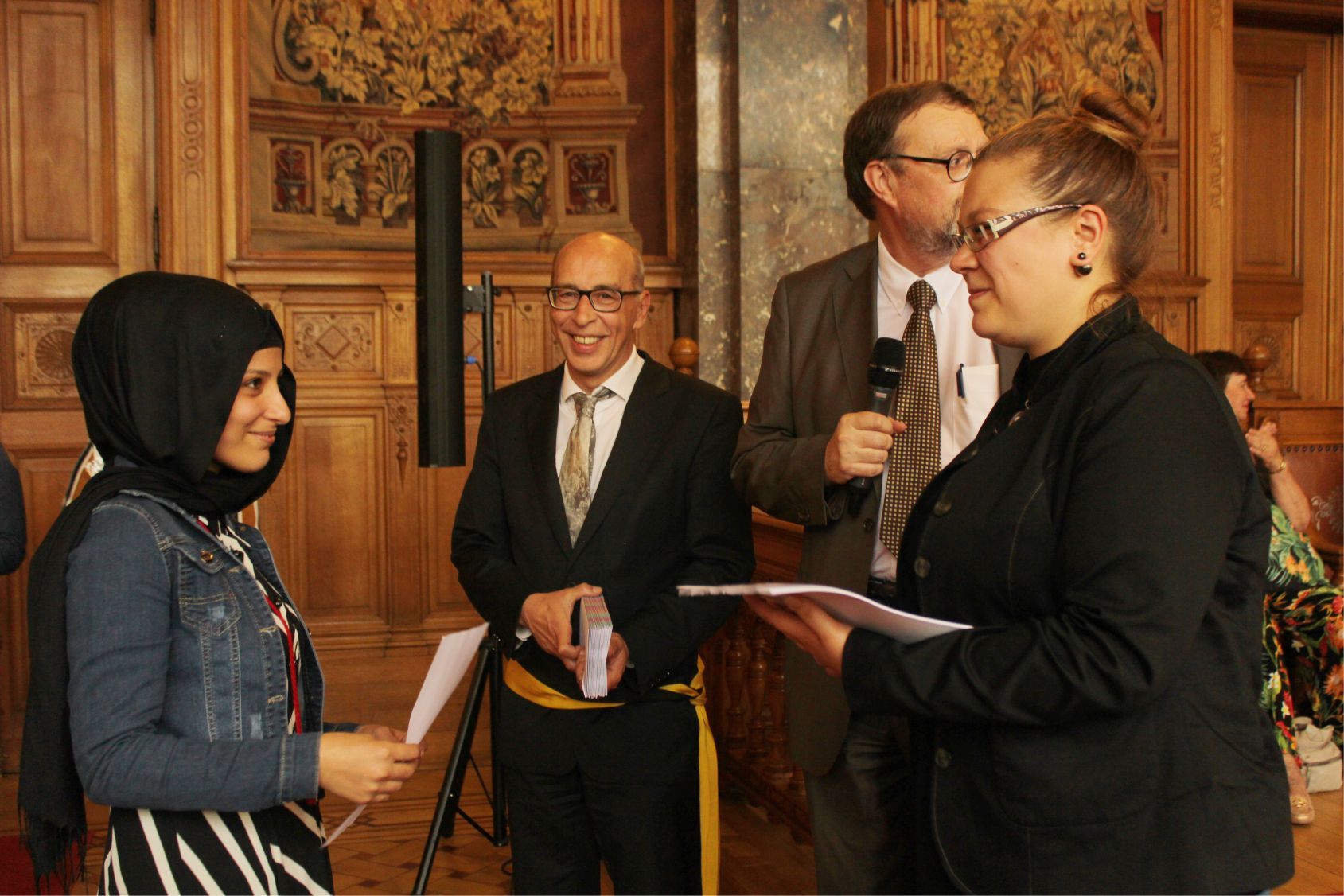 Schaerbeek belediye salonunda gerçekleştirilen sertfika töreninde, Schaerbeek belediyesi Eğitim’den sorumlu başkan yardımcısı Michel De Herde, Ecole de Promotion Social de Schaerbeek Direktörü Jean Louis Brismee ve kurs hocaları birlikte sertfikaları kursiyerlere takdim ettiler.