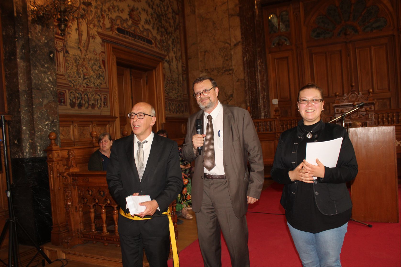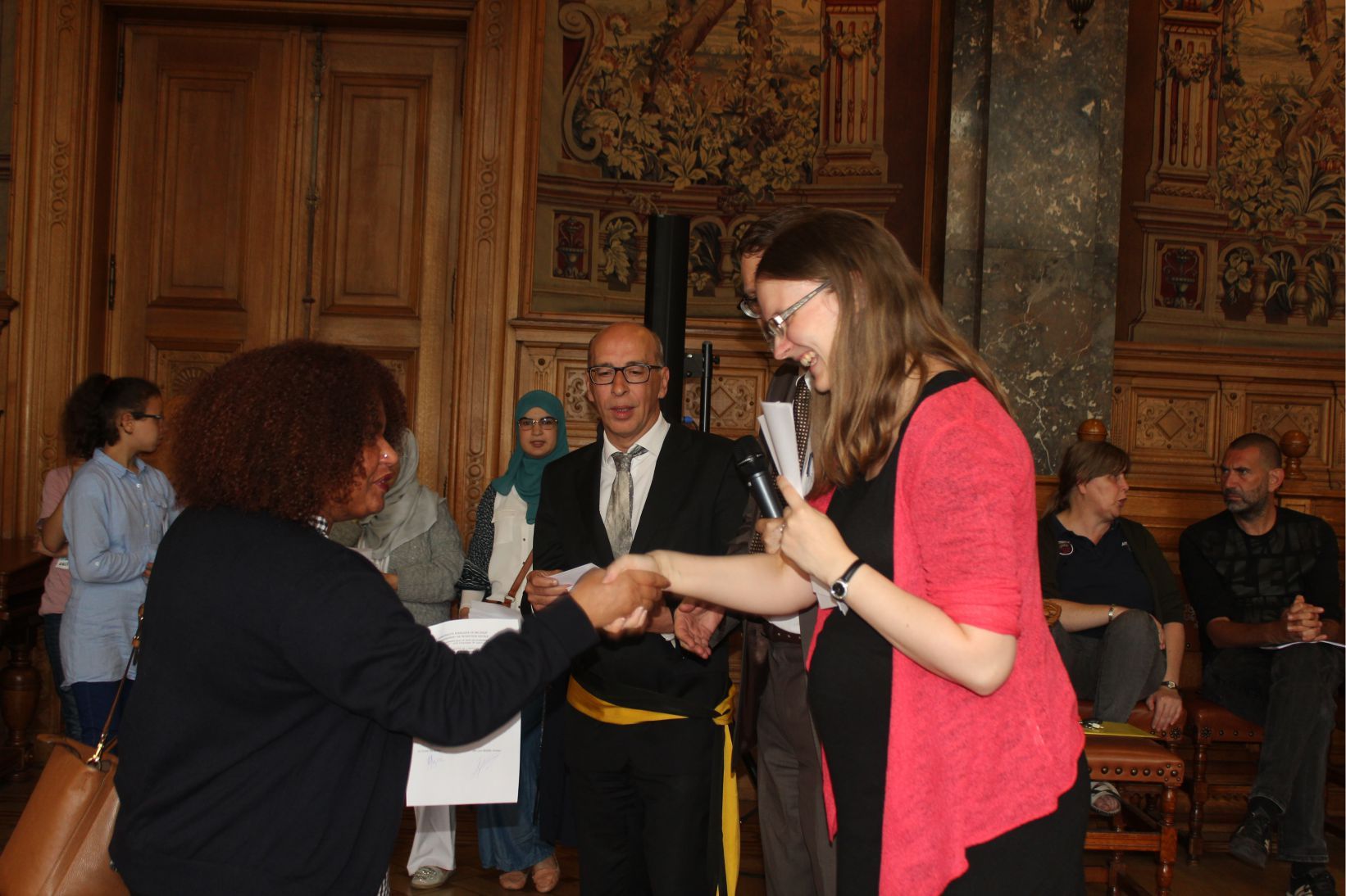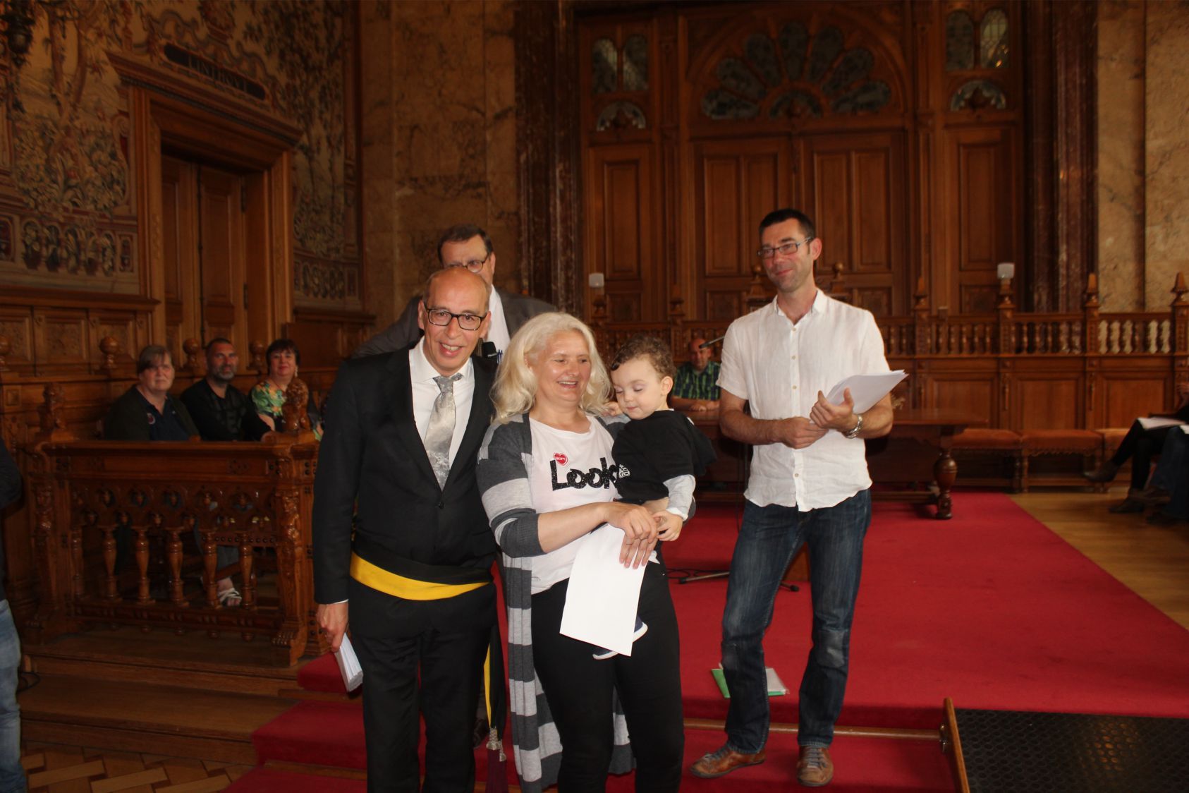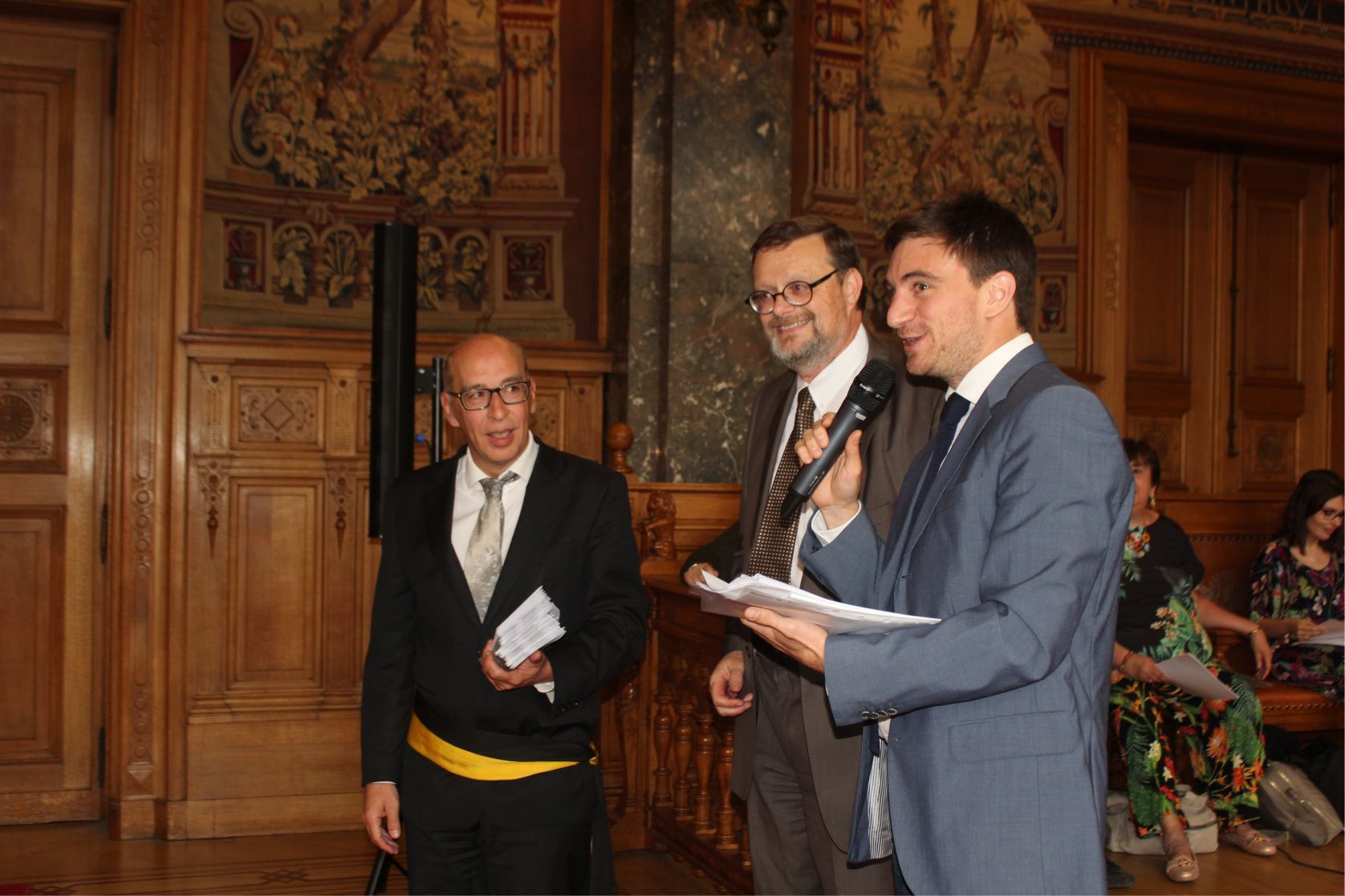 Schaerbeek belediye salonunda gerçekleştirilen sertfika töreninde, Schaerbeek belediyesi Eğitim’den sorumlu başkan yardımcısı Michel De Herde, Ecole de Promotion Social de Schaerbeek Direktörü Jean Louis Brismee ve kurs hocaları birlikte sertfikaları kursiyerlere takdim ettiler.