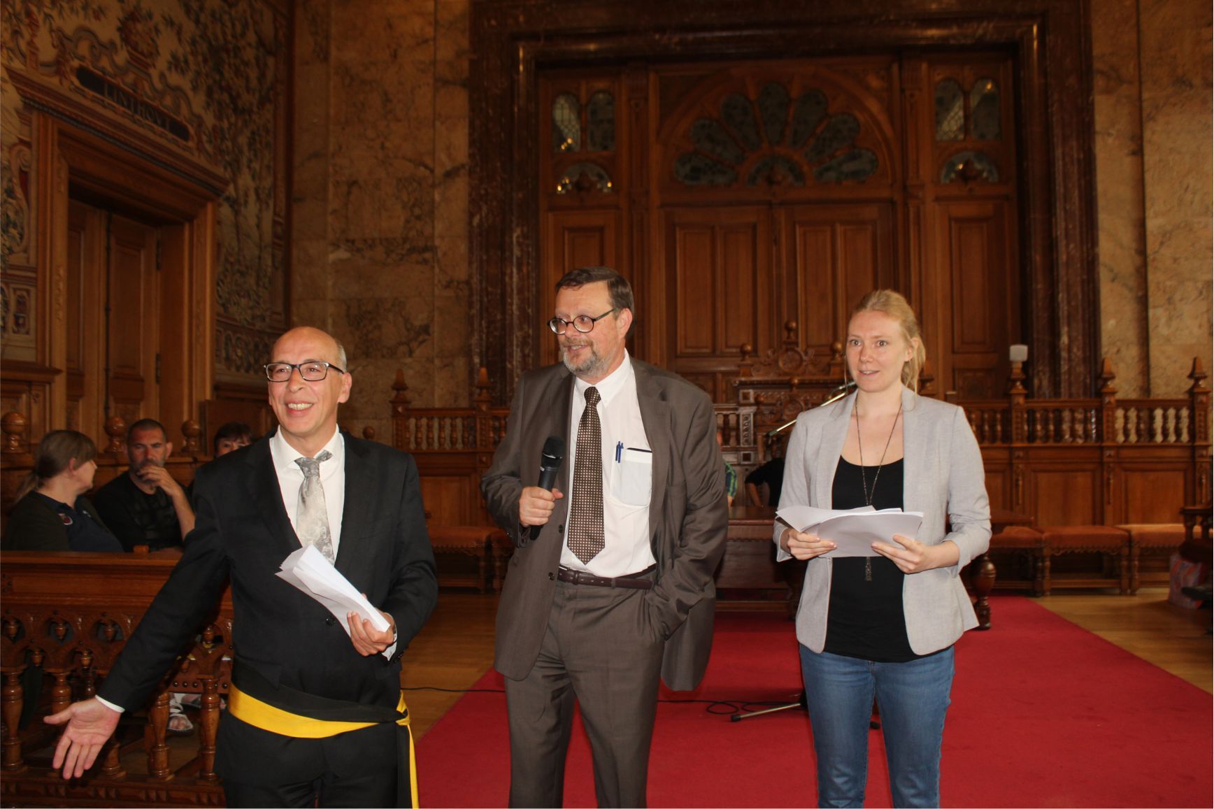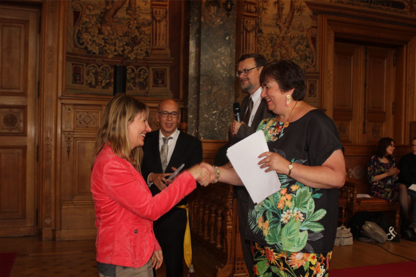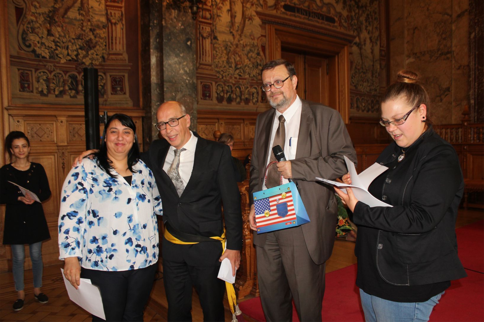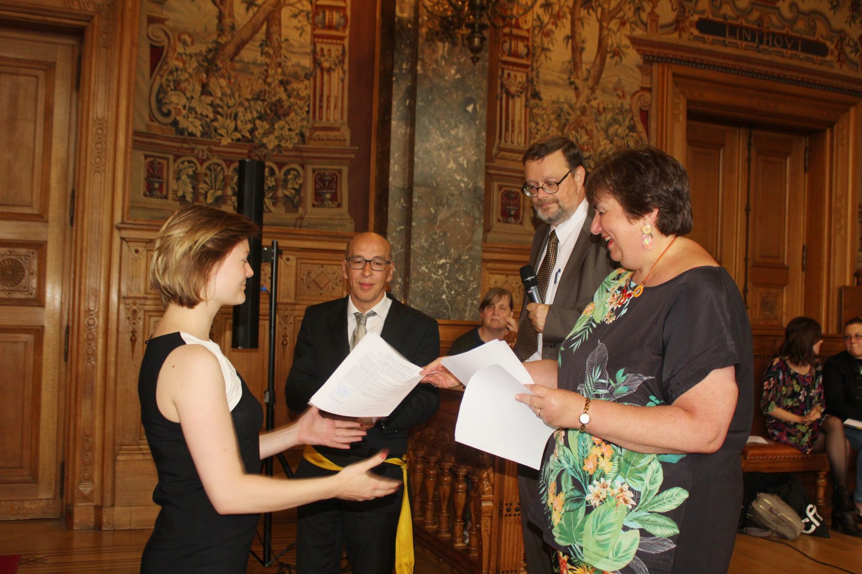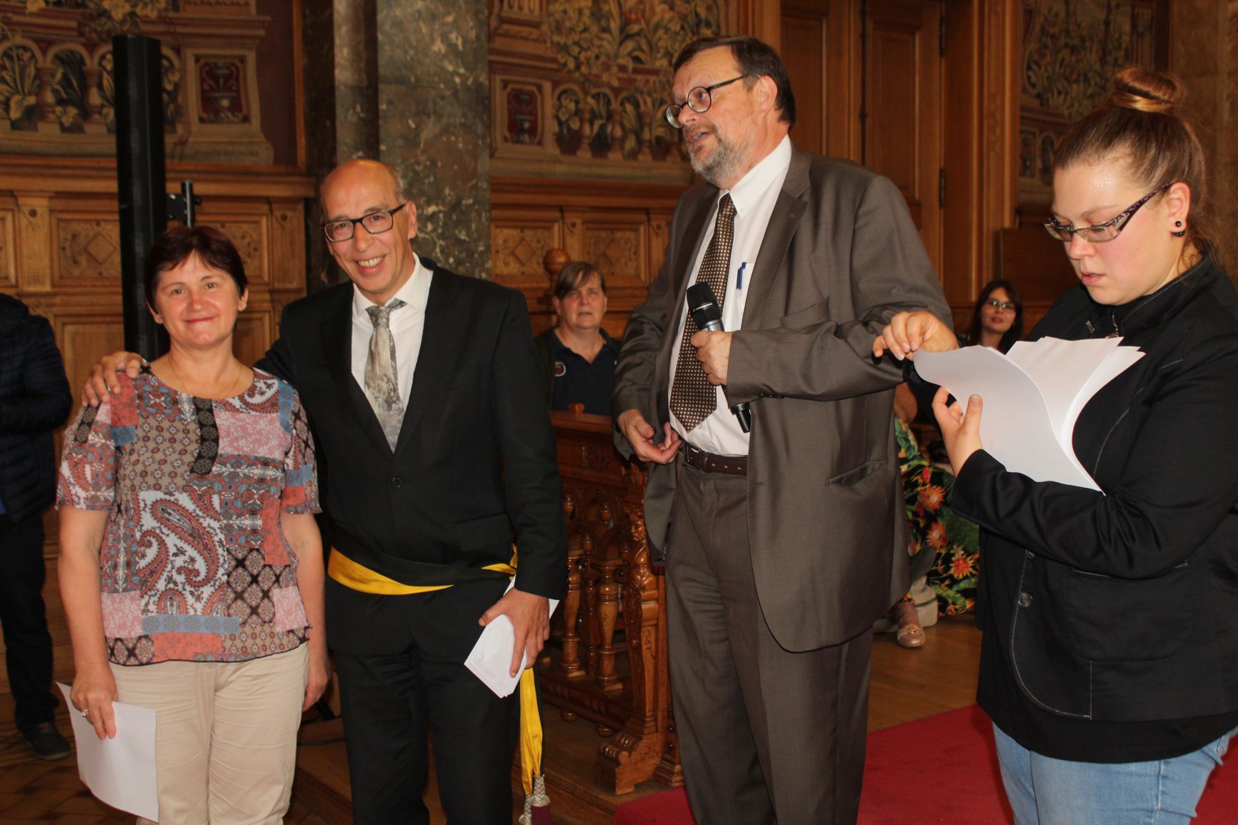 Schaerbeek belediye salonunda gerçekleştirilen sertfika töreninde, Schaerbeek belediyesi Eğitim’den sorumlu başkan yardımcısı Michel De Herde, Ecole de Promotion Social de Schaerbeek Direktörü Jean Louis Brismee ve kurs hocaları birlikte sertfikaları kursiyerlere takdim ettiler.