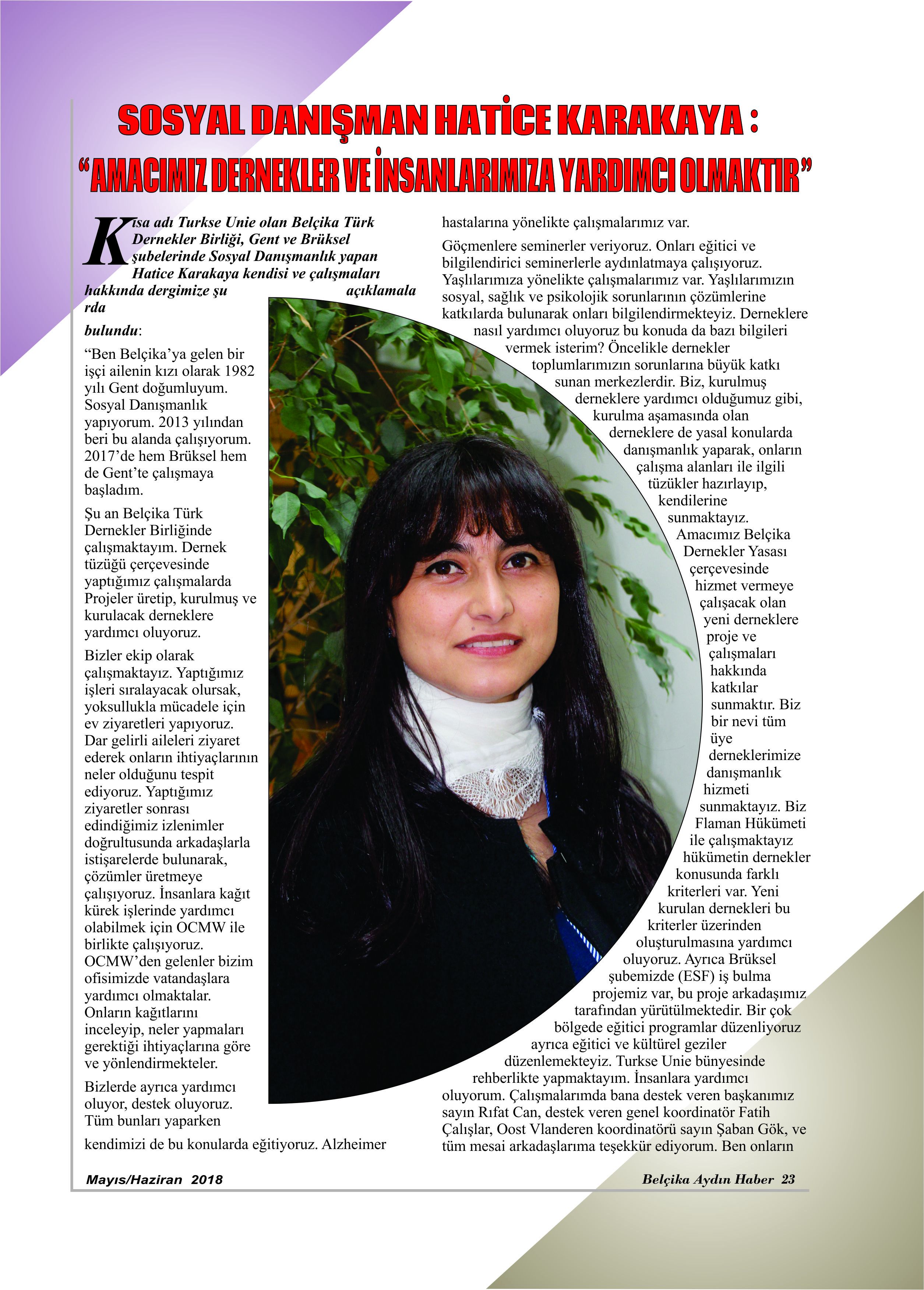 Kısa adı Turkse Unie olan Belçika Türk Dernekler Birliği, Gent ve Brüksel şubelerinde Sosyal Danışmanlık yapan Hatice Karakaya kendisi ve çalışmaları hakkında dergimize şu açıklamalarda bulundu: