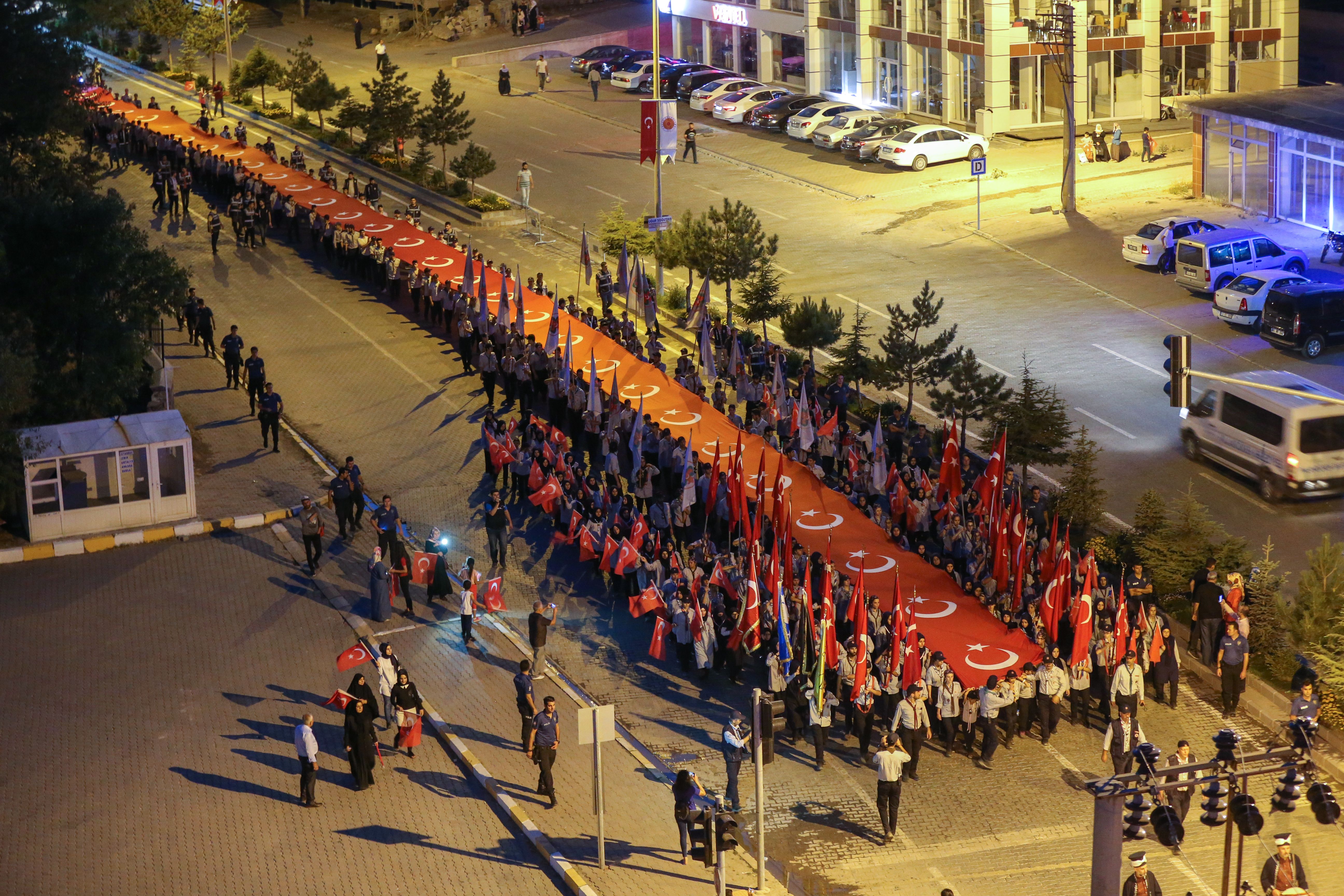 Vatandaşların 300 metre uzunluğunda Türk bayrağı açarak tekbir getirdiği, atlı birlikler ile mehter takımının da katıldığı yürüyüşe, çevredekiler alkışlarla destek verdi.