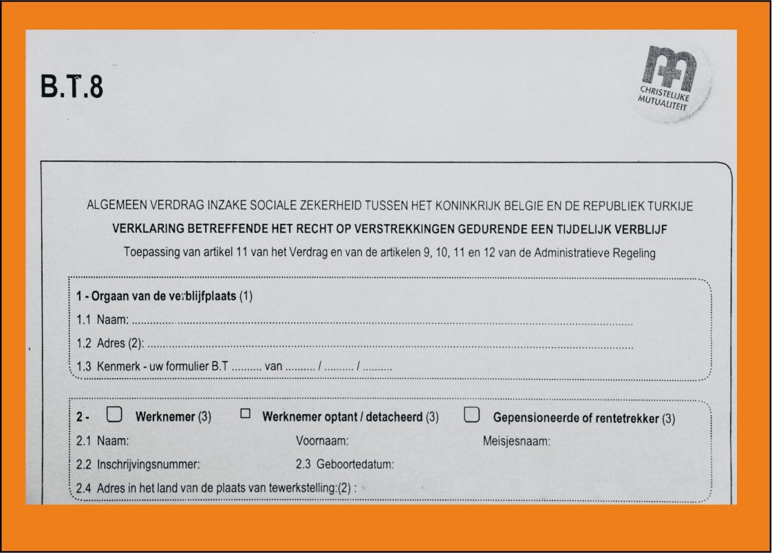 Kamuoyunda tarafından Sağlık Sigortası diye bilinen BT8 belgesi, 2014 yılında Valon Parlamentosu'na takılmış; dönemin Belçika eski Sağlık Bakanı Laurette Onkelinx ve Türkiye eski mevkiidaşı Faruk Çelik tarafından iki ülke vatandaşlarına ilave haklar sağlayan bir sosyal güvenlik anlaşması imzalanmıştı. 2015 yılında ise konuyu ele alıp araştıran Belçika Federal Milletvekili Veli Yüksel (CD&V), anlaşmanın yürürlüğe girmediğini saptadı.
