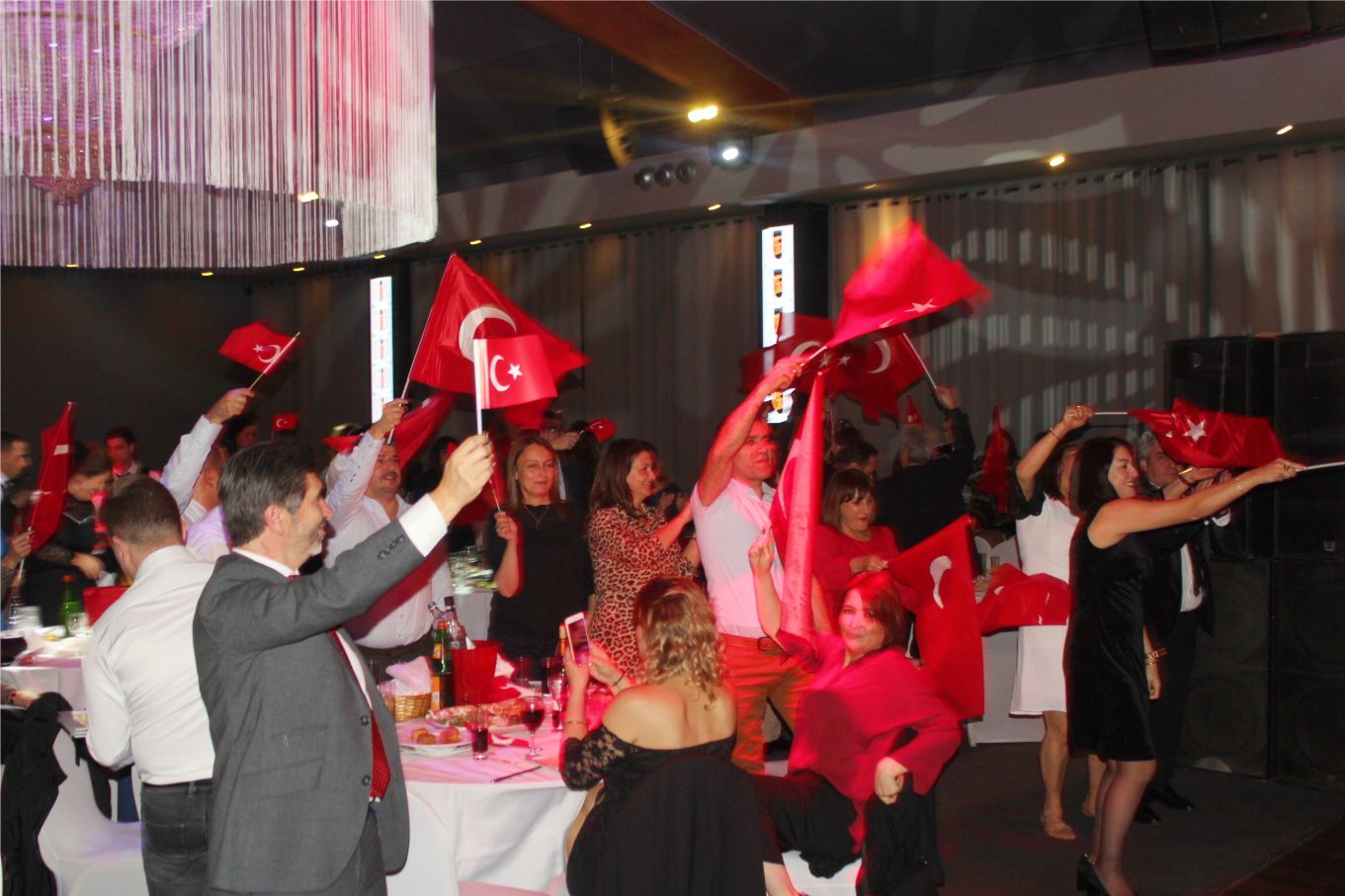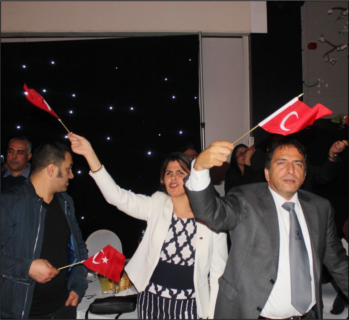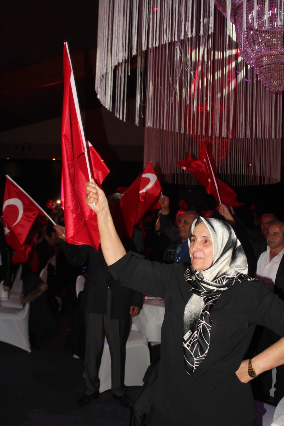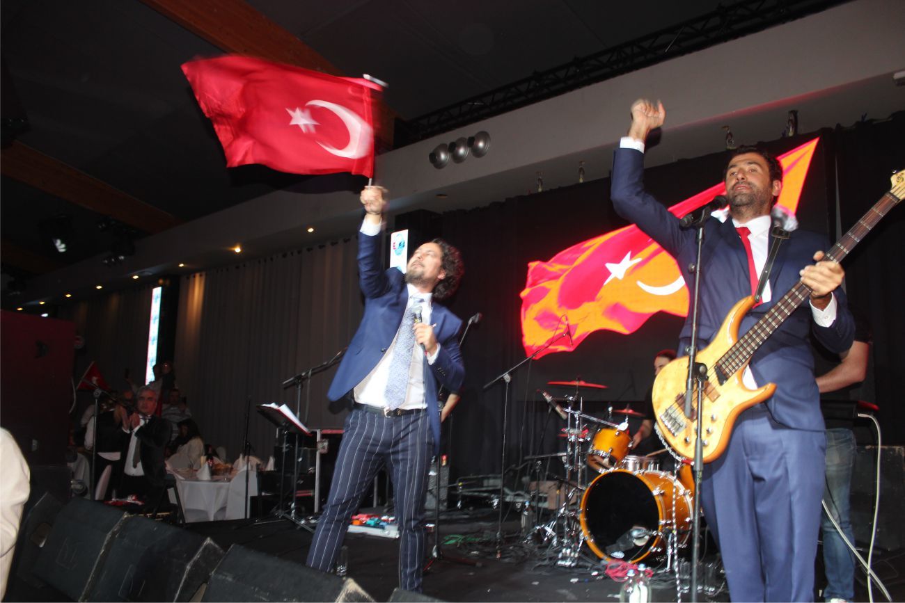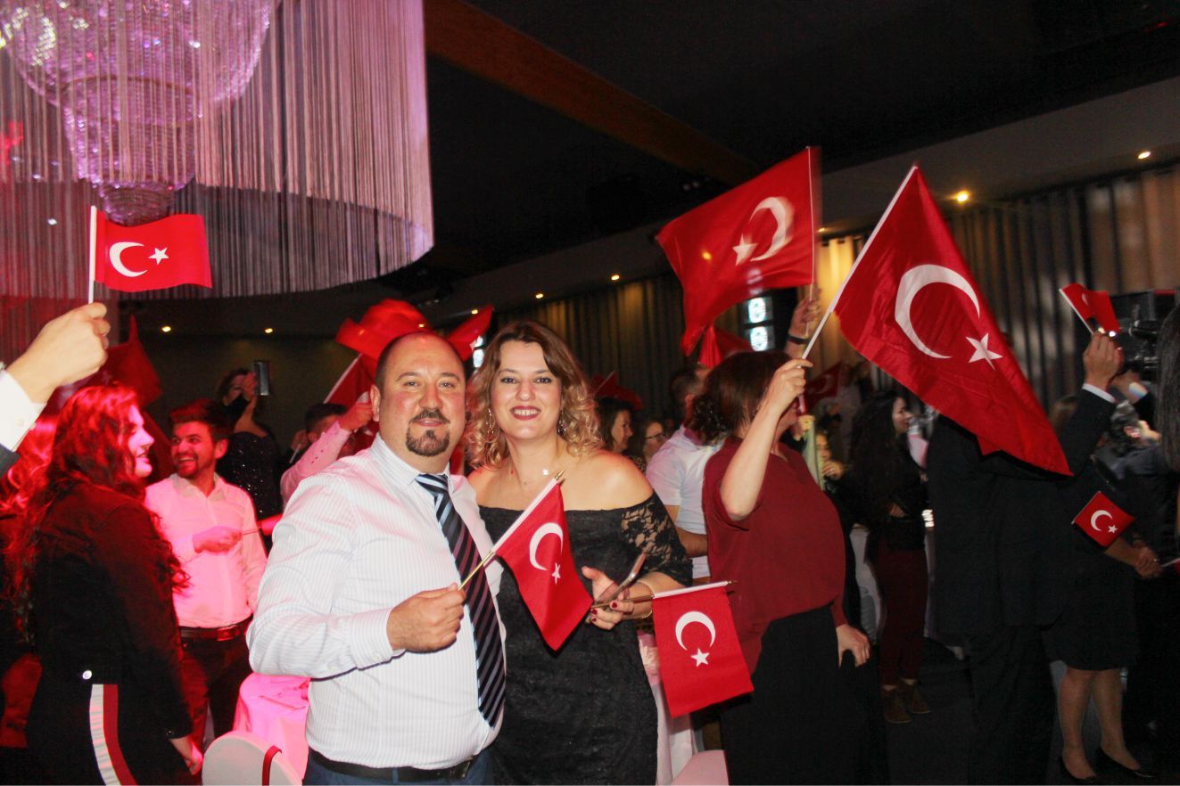 Ellerindeki Türk bayraklarıyla gecenin geç saatlerine kadar kutlamaya katılan davetliler, ilk olarak hep birlikte şehitlere saygı duruşunda durup ve İstiklal marşının okunmasıyla program start aldı.