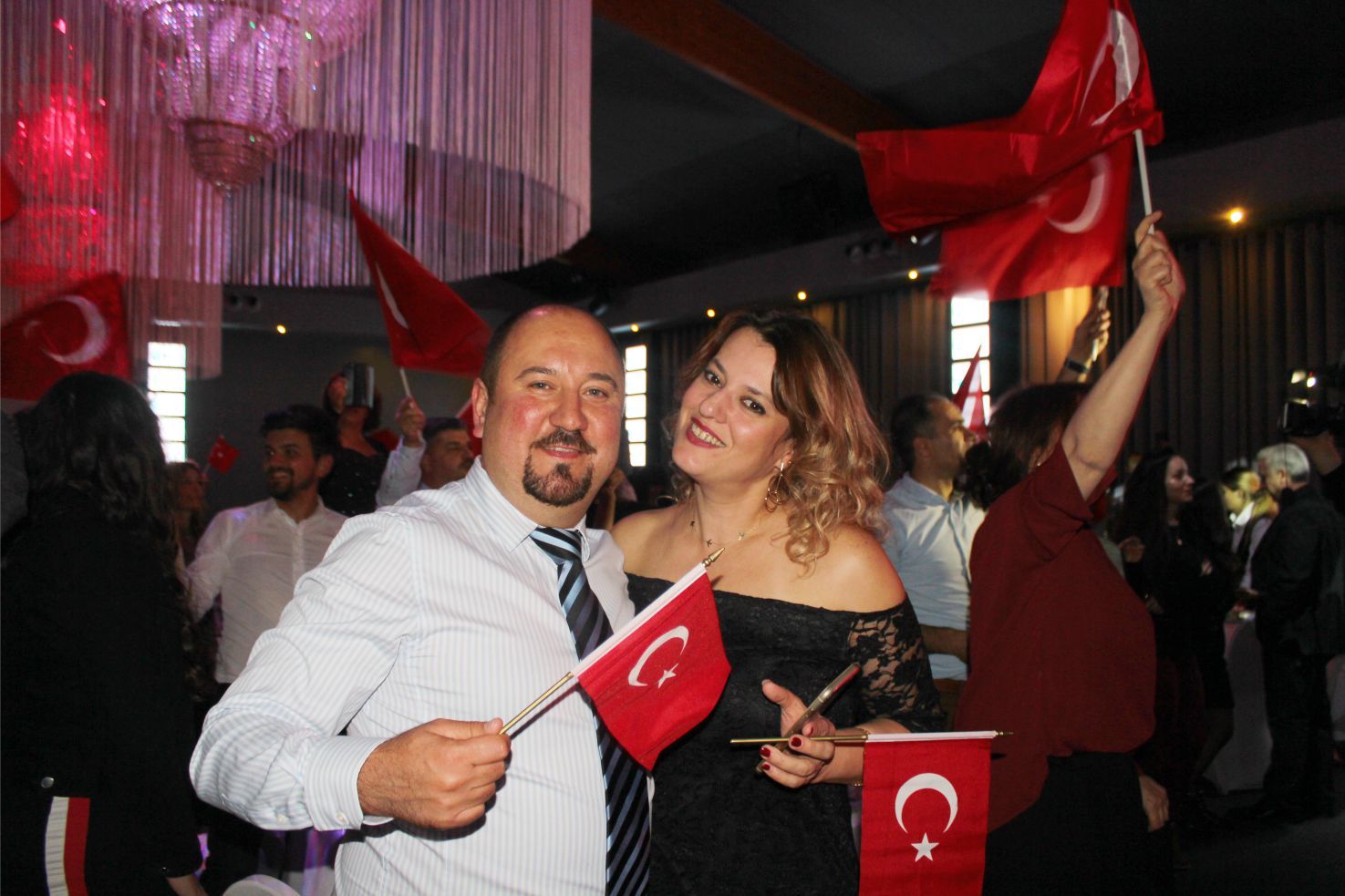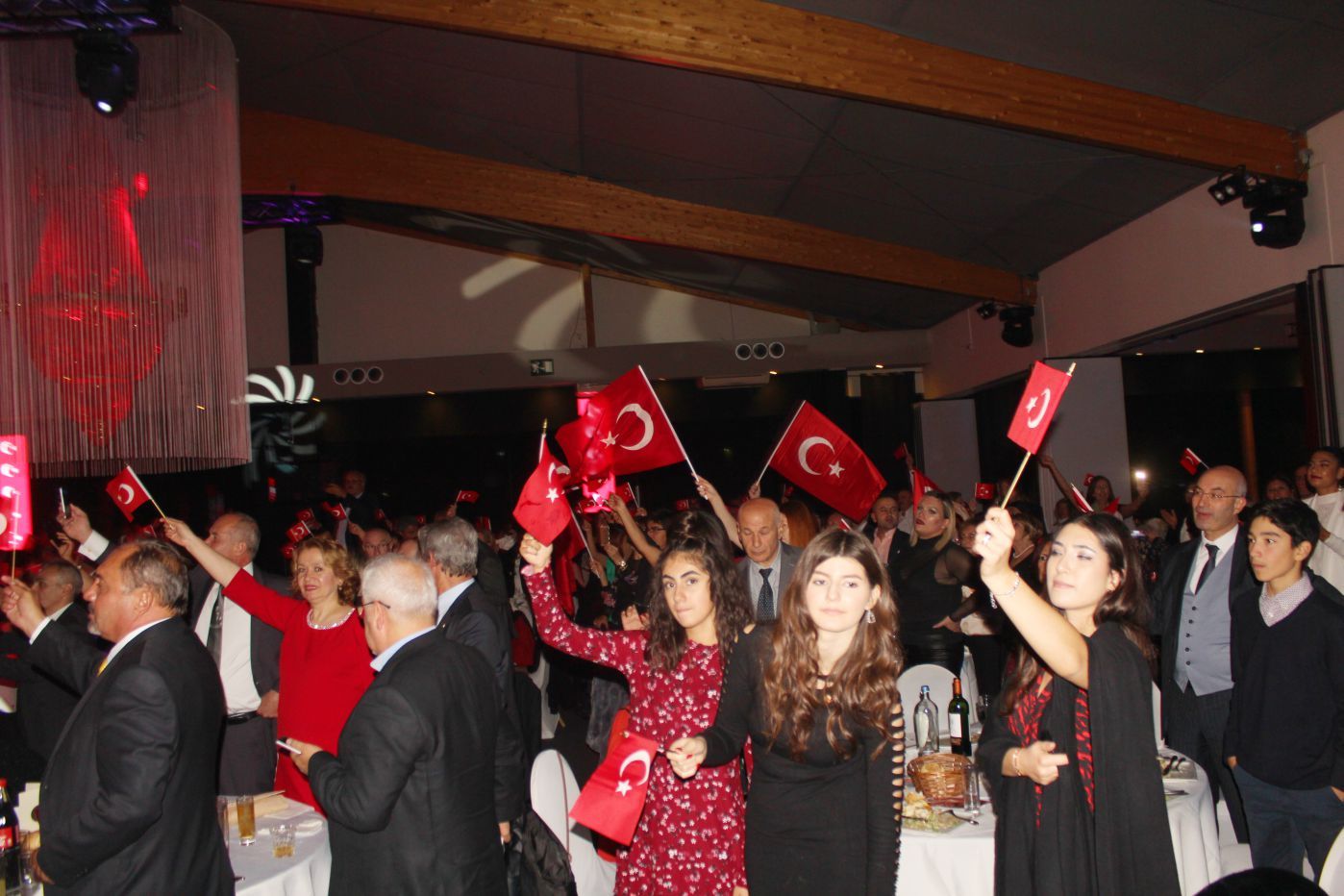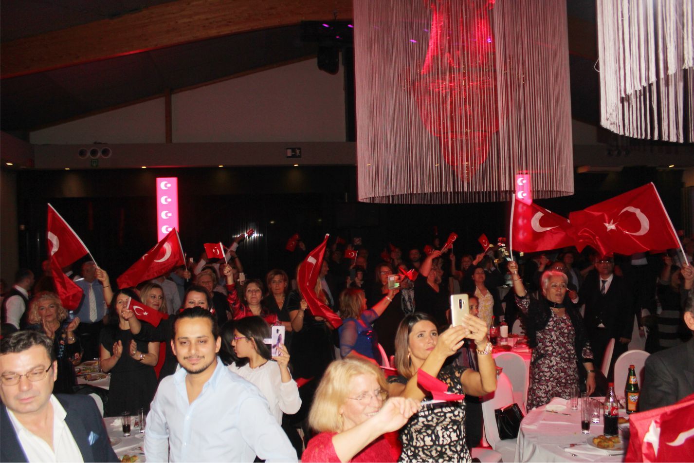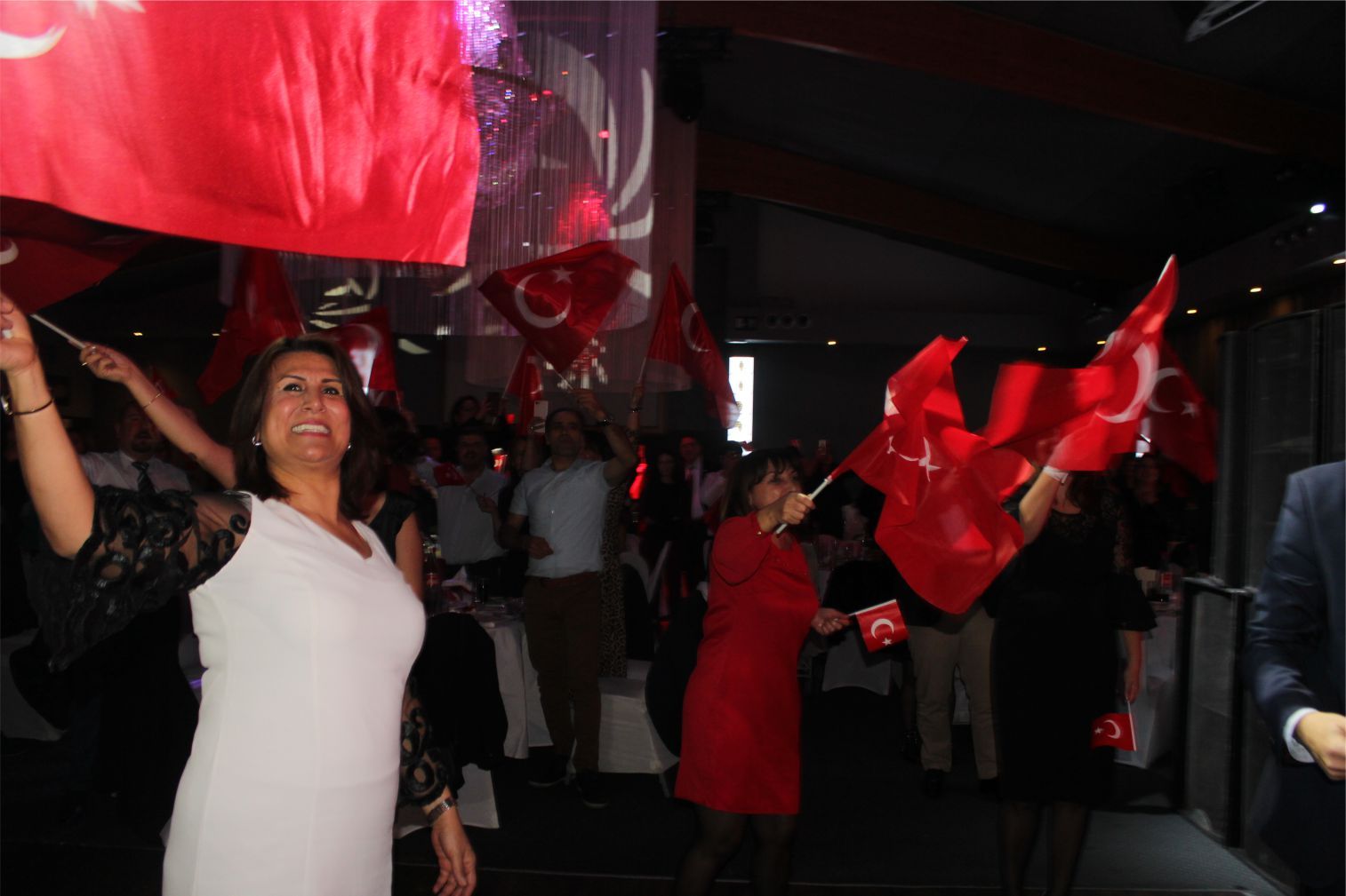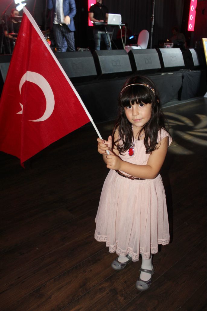 Ellerindeki Türk bayraklarıyla gecenin geç saatlerine kadar kutlamaya katılan davetliler, ilk olarak hep birlikte şehitlere saygı duruşunda durup ve İstiklal marşının okunmasıyla program start aldı.