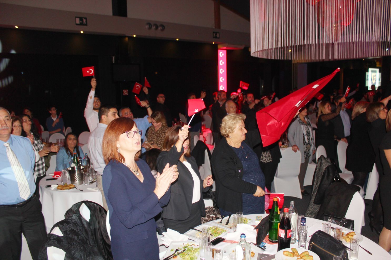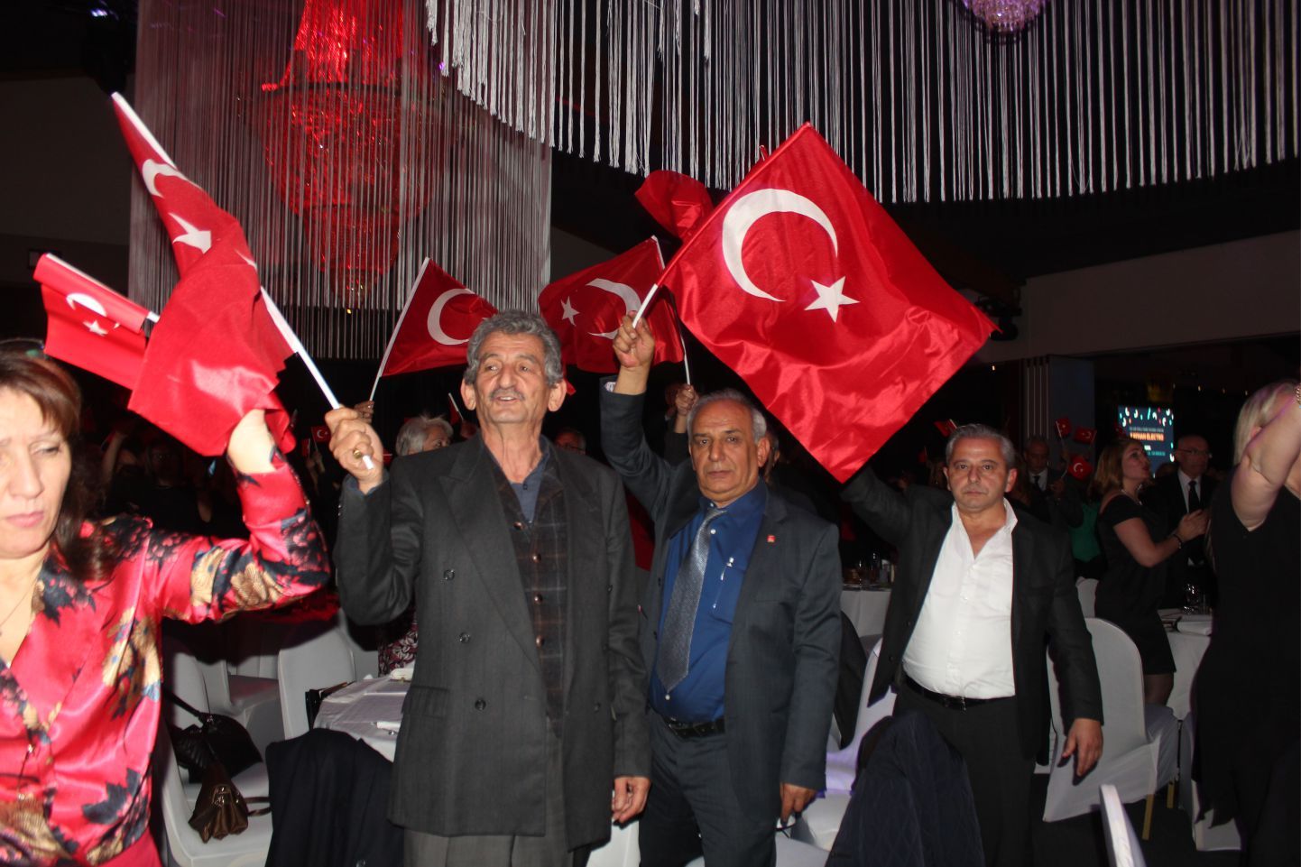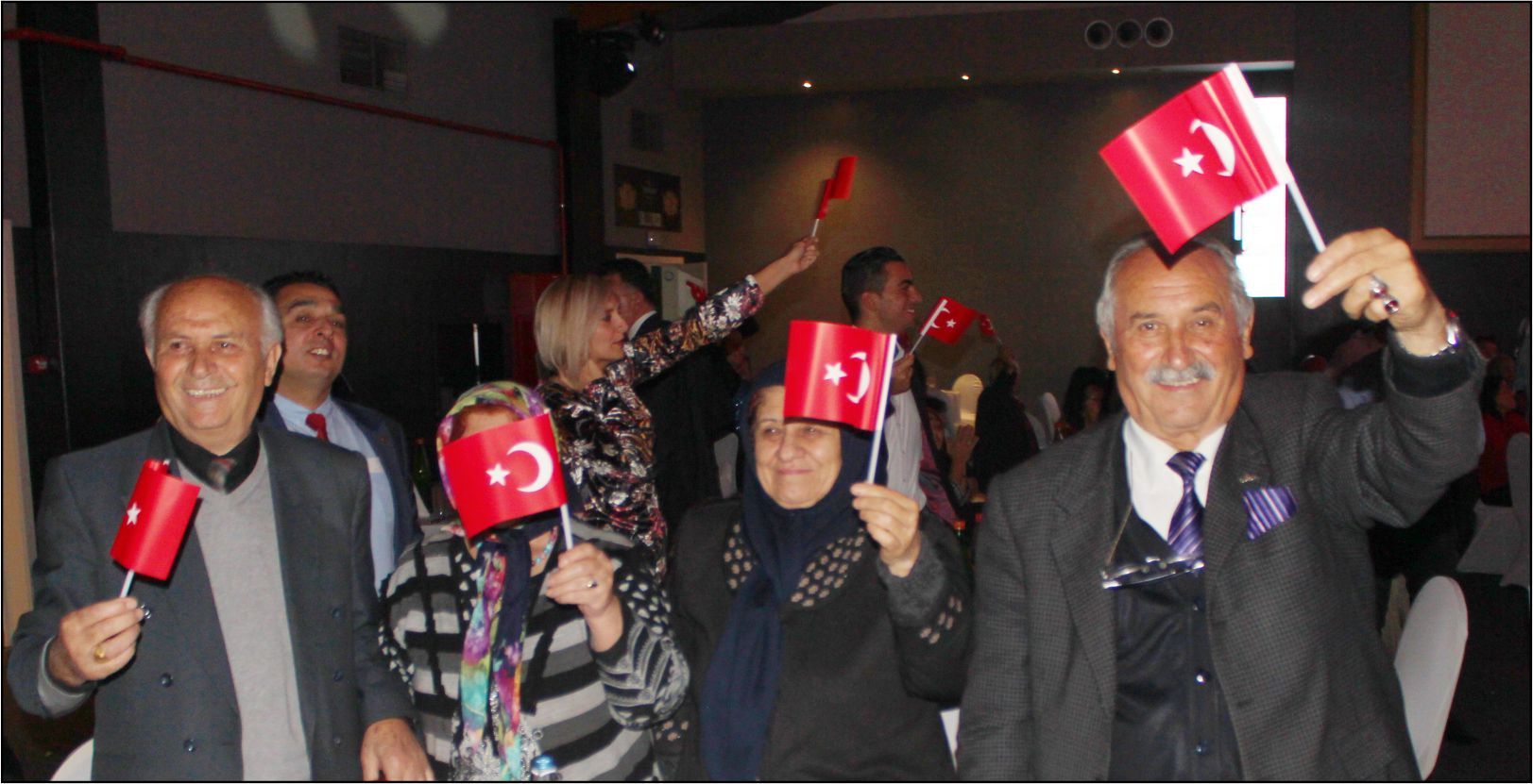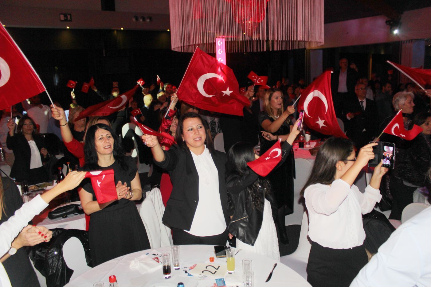 Ellerindeki Türk bayraklarıyla gecenin geç saatlerine kadar kutlamaya katılan davetliler, ilk olarak hep birlikte şehitlere saygı duruşunda durup ve İstiklal marşının okunmasıyla program start aldı.