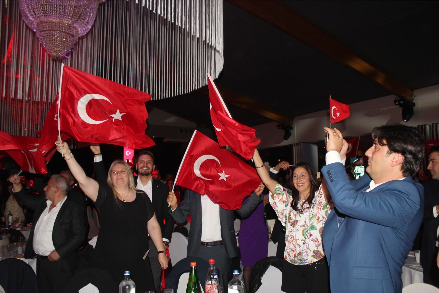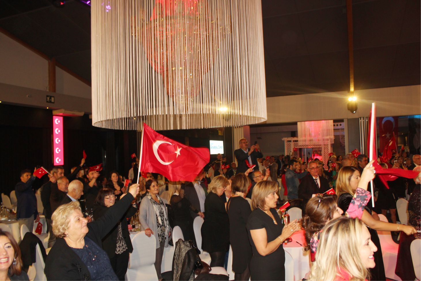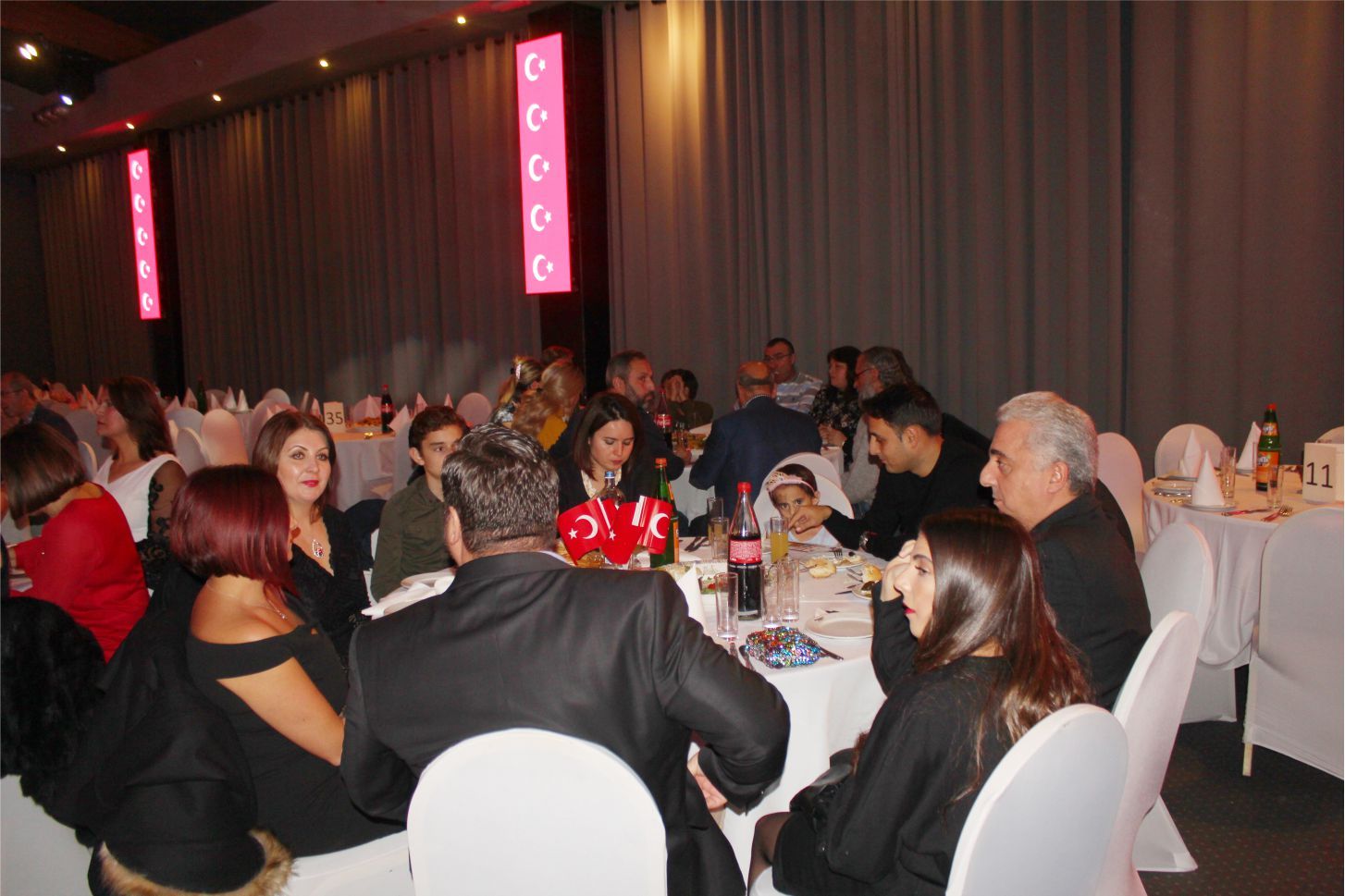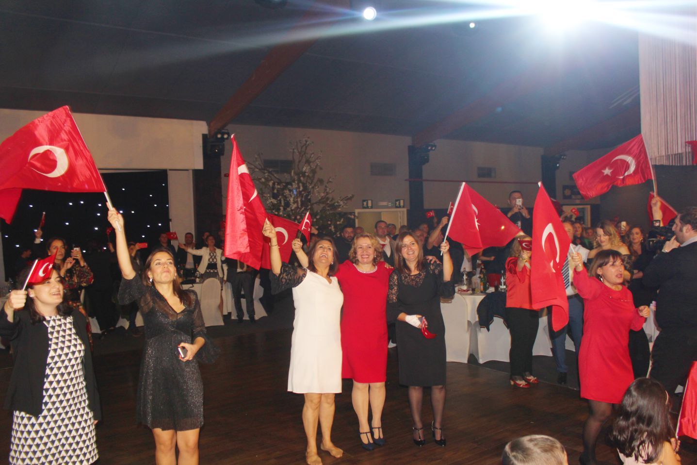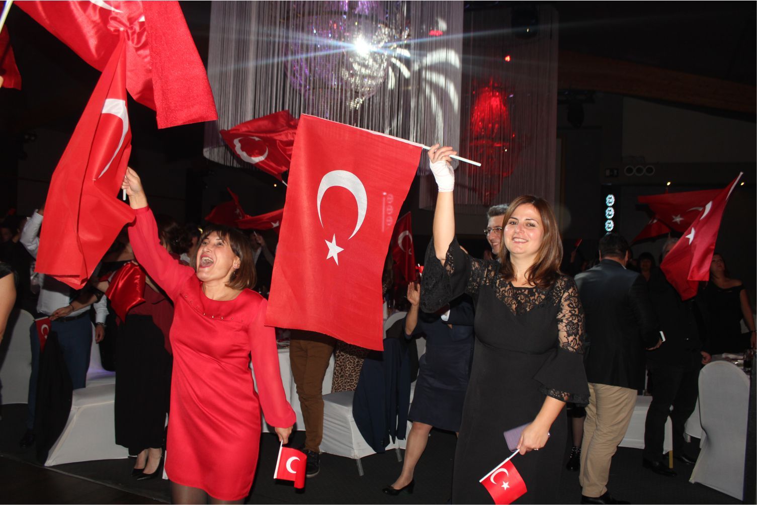 Ellerindeki Türk bayraklarıyla gecenin geç saatlerine kadar kutlamaya katılan davetliler, ilk olarak hep birlikte şehitlere saygı duruşunda durup ve İstiklal marşının okunmasıyla program start aldı.