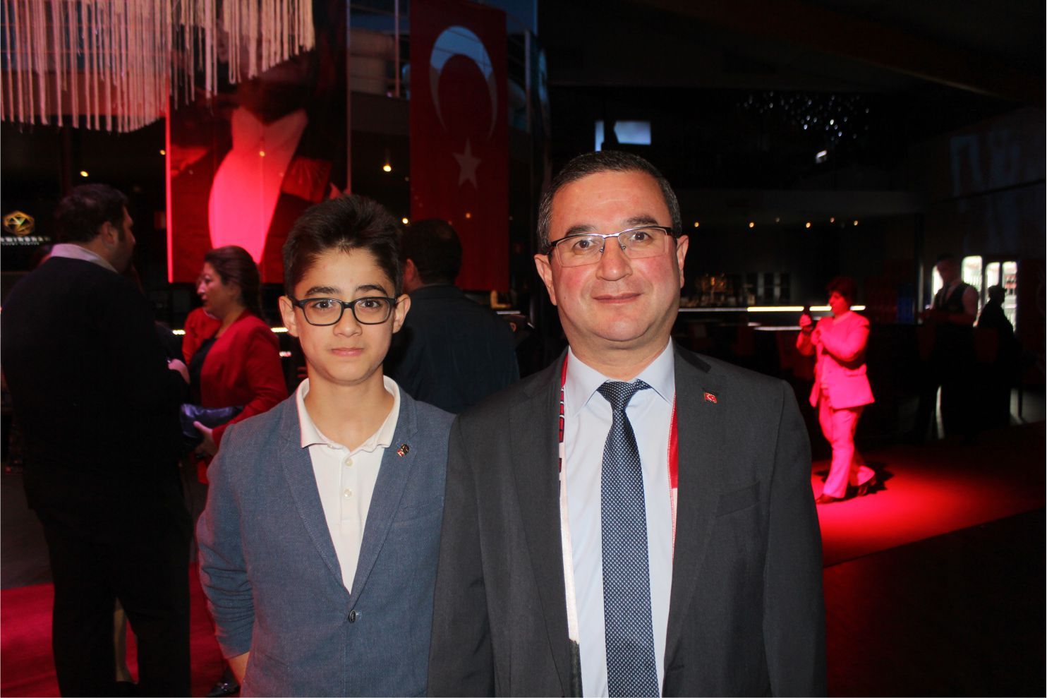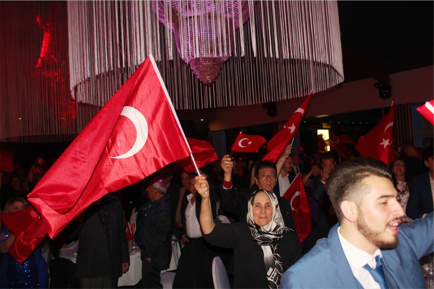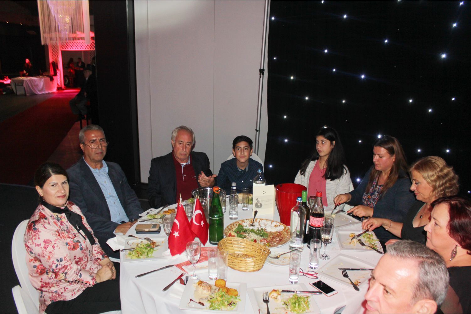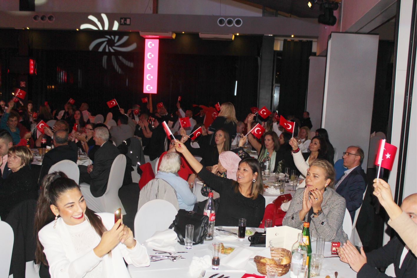 Ellerindeki Türk bayraklarıyla gecenin geç saatlerine kadar kutlamaya katılan davetliler, ilk olarak hep birlikte şehitlere saygı duruşunda durup ve İstiklal marşının okunmasıyla program start aldı.