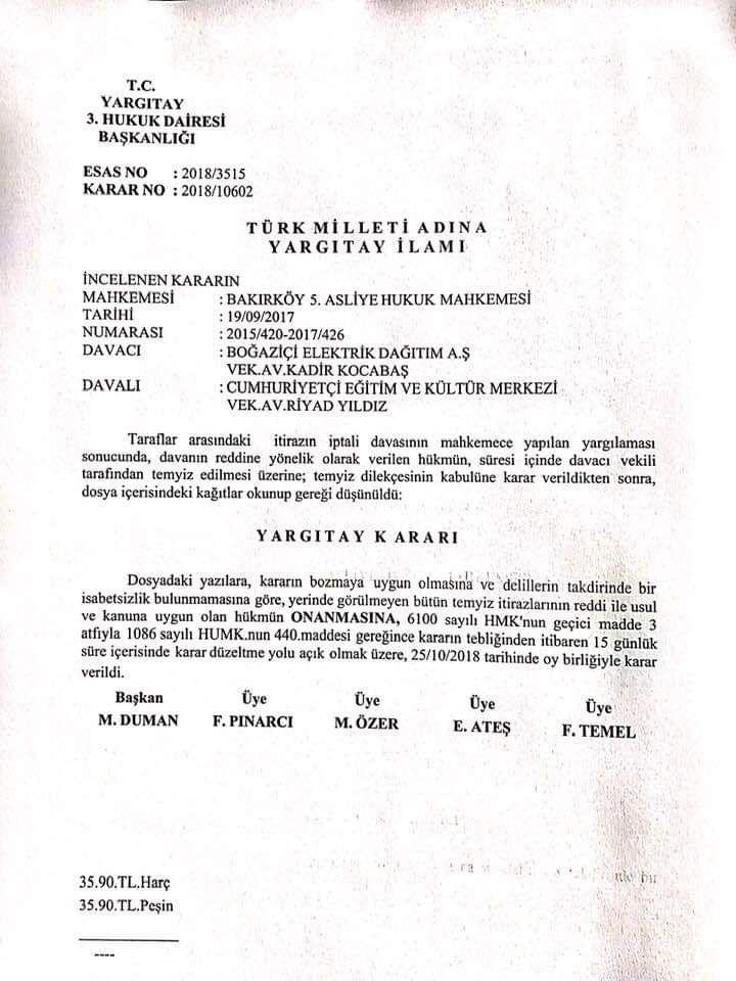 AİHM’in 2014 yılındaki kararının ardından Yargıtay’ın dosyayı bozma kararı verdiğini belirten Cam şunları söyledi: Yeniden inceleme yapılması için mahkemeye gönderdi. Mahkeme dosyaları yeniden ele aldı. Bilirkişi incelemesi yapıldı, tespitler yapıldı. Cemevlerinin elektrik giderlerinin karşılanması yönünde mahkeme olumlu bir şekilde BEDAŞ’ın açtığı davaya reddetti. BEDAŞ temyiz etti. Dosya Yargıtay’a gitti tekrar ve Yargıtay, BEDAŞ’ın aleyhine olan bu kararları onadı.