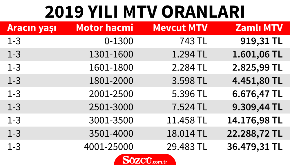 2019 MTV ücretleri ne kadar olacak? Zamlı 2019 yılı Motorlu Taşıtlar Vergisi ve pasaport ücretleri… Gelecek yıl pasaport, ehliyet harçları, ve motorlu taşıt vergisi (MTV) yüzde 23.73 artırılacak. Buna göre 1-3 yaş arası 0-1300 cc'lik bir otomobilin vergisi 743 TL'den 919 TL'ye çıktı. 10 yıllık bir pasaport sahibi olmak isteyen kişi defter bedeli dahil 940 TL'den fazla para ödeyecek. İşte MTV ücretleri ve pasaport harçlarında 2019 detayları...