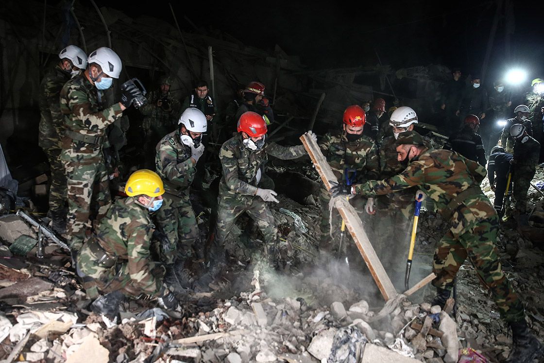 Olay yerinden alınan bilgiye göre, Gence'de enkaz alanında arama kurtarma çalışmaları devam ediyor.