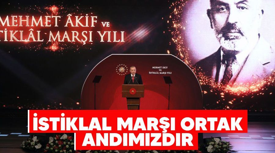 Merhum Akif'in örnek hayatı yanında geride milli mutabakat metni olan İstiklal Marşı'nı da bıraktığını belirten Cumhurbaşkanı Erdoğan, 'İstiklal Marşı'mızın 10 kıtası bizim milli andımızdır. Elbette her milletin bağımsızlığının nişanesi olan bir milli marşı vardır. Ancak, yedi düvele karşı yürütülen Kurtuluş Savaşı sırasında her mısrası gözyaşları ile kabul edilen bir başka marş yoktur' diye konuştu.