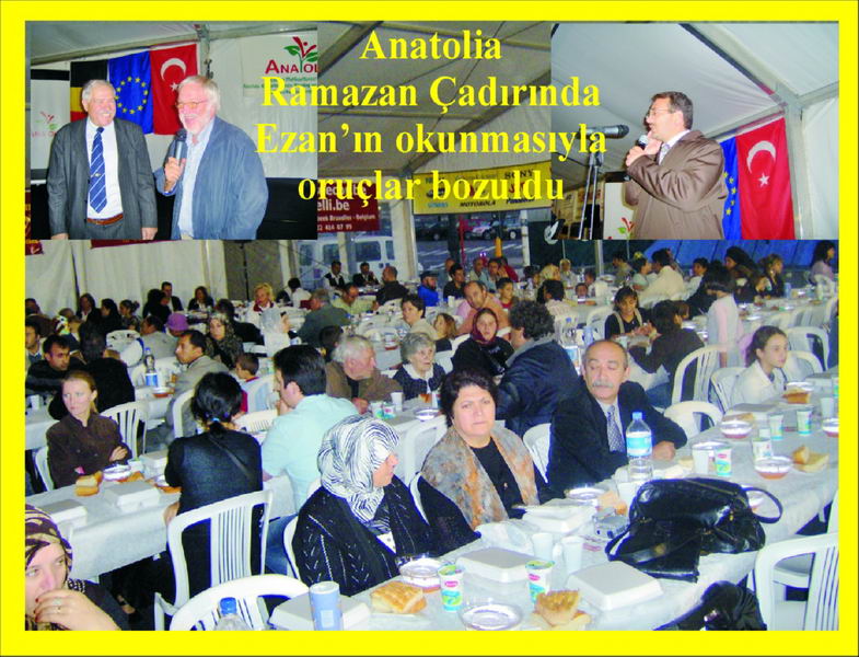 Belçika Brüksel'de bulunan kısa adı 'Anatolia' olan Anadolu Kültürlerarası Diyalog ve Yardımlaşma Derneği geleneksel iftar programını bu yıl Place Rogierâdeki Dexia Bank, Pyramide, Sheraton ve Hilton hotelerinin bulunduğu meydanda kurduğu çadırda gerçekleştirdi. Yaklaşık 1200 kişiye iftar verilecek olan Ãadır 15-24 eylül arası açık kalacak. Kurulan Ãadır etrafındaki reyonlarda kültürel ve sosyal hizmetler verilmekte. Belçikalıâlarcaâda büyük ilgiyle izlenen iftar programının ilk günkü programına Brüksel Hükümeti Ãevre Bakanı Emir Kır, Pakistan Başkonsolosu Dr. Syed Rizwan Ahmet ve eşi, Federal Milletvekili Cemal Ãavdarlı, Saint Josse Belediye Başkanı Jean Demmane, Eskişehir Tepebaşı Belediye Başkanı Dr.Tacettin Sarıoğlu, Anatolia Dernek Başkanı Abdullah Yiğit, Anderlecht Belediye Meclis Ãyesi Hediye Yiğit, Evere Belediyesi Meclis Ãyesi Nebahat Acar, Saint Josse Belediye Meclis Ãyesi Havva Ardıçlık, Iğdırlı İşadamları Derneği (BİŞAD) Başkanı Erol Alagöz, BİŞAD Yönetim Kurulu Ãyesi Nimet Ersoy, Dr. Abdulkadir Kara, İşadamı Ãmer Şen ve kalabalık bir davetli topluluğu katıldı. Ezanâın okunmasıyla oruçlar açıldı. İlk gün olmasına rağmen kalabalık bir katılım gözlendi. İftar yemeğinde Belçikalılarında bulunması dikkat çekti. İftar sonrası yapılan Protokol konuşmalarında Anatoli Başkanı Abdullah Yiğitâîn davetlilere etkinliğe katkıda bulunanlara teşekkür etmesinin ardından Saint Josse Belediye Başkanı Jean Demmane yaptığı kısa konuşmasında "bu programa ev sahipliği yapmaktan duyduğu memnuniyeti" dile getirerek, protokol ve tüm davetlilere "hoş geldiniz" diyerek teşekkür etti. Daha sonra Bakan Emir Kır yaptığı konuşmada : "Son günlerde İslamâa ve müslümanlara yönelik menfi tavırlara bu organizasyon güzel bir cevaptır. Her zaman entegrasyondan yana olan müslümanların bu çadırı Belçikalı dostlarıyla paylaşması çok anlamlıdır. Müslümanlara yönelik gösteri yürüyüşü yasaklandı. Buradan yetkililere teşekkür ediyorum. Tansiyonu düşürdüler. Gerek Belediye, gerekse Hükümet olarak Anatoliaânın yanında olacağız. Kültürel ve sosyal faaliyetlerine desteklerimiz devam edecektir. Hepinize hayırlı ramazanlar diliyorum » dedi. Federal Milletvekili Cemal Ãavdarlıâda bu programdan duyduğu sevinci dile getirerek, yetkililere teşekkür etti. Konuk Eskişehir Tepebaşı Belediye Başkanı Tacettin Sarıoğlu ise konuşmasında "Memleketten uzak diyarlarda ve Avrupaânın göbeğinde siz değerli hemşehrilerim ve davetlilerimizle bir arada bulunmaktan dolayı çok mutluyum. Bir zamanlar atalarımızın buralara kadar geldikleri zamanı teneffüs ettim. Bir an çok dugulandım. Asırlar sonrası bizler burada birarada bu güzel günleri idrak ediyoruz. Bizlere bu imkanları sunan tüm yetkililere ve Anatoli aderneği çalışanlarına teşekkür ediyorum » dedi. Organizasyona maddi katkıda da buluna Tepebaşı belediyesi ilk günün iftar masrafına da sponsor olmuştu. Belediyenin kültürel katkılarda da bulunduğu bildirildi. Belediyeâye ait ekip Anadoluânun manevi mimarlarından olan Yunus Emreâden şiir ve ilahiler okudular. Daha sonra Mevlanaâdan da beyitler eşliğinde semazenler nefis bir gösteri sundular. Belçikalıların ilgiyle izlediği gösteri sonrası göstericiler alkışlandılar. Brükselâin meşhur Işıklı Binası dibindeki kültürel etkinliklere Işık gösterileride ayrı bir zenginlik katıyordu. Programın 9 gün daha devam edeceği 17 eylülki iftar programına büyükelçi Fuat tanlayâın da katılması bekleniyor. www.belcikahaber.be